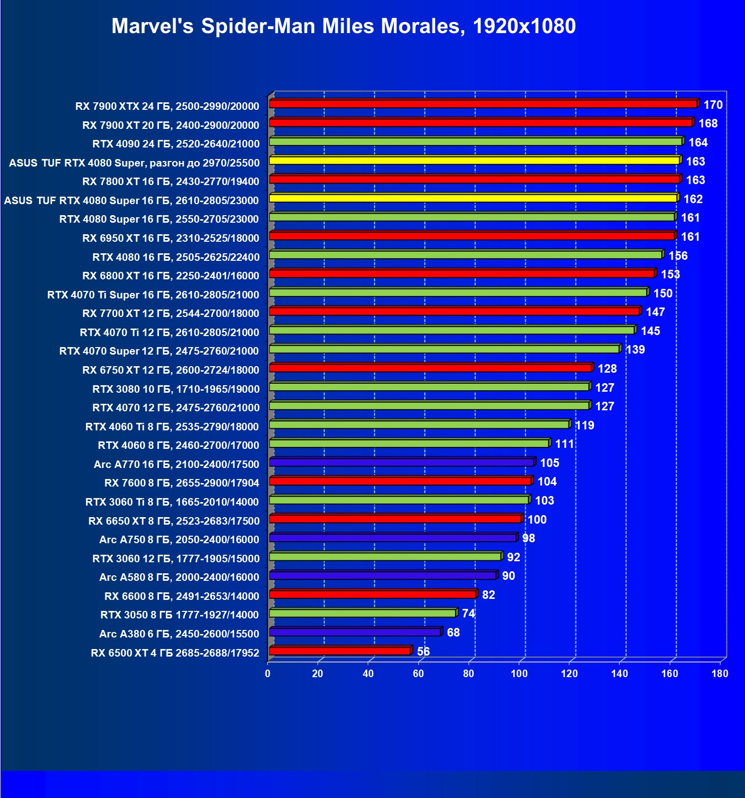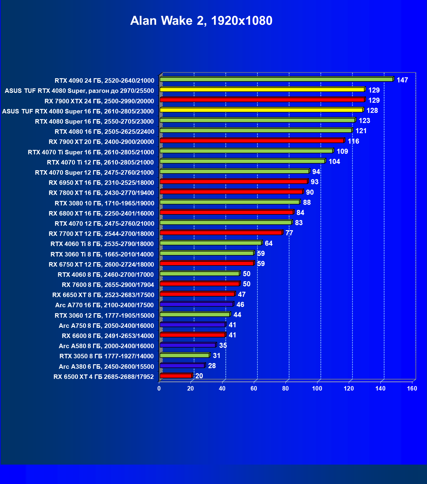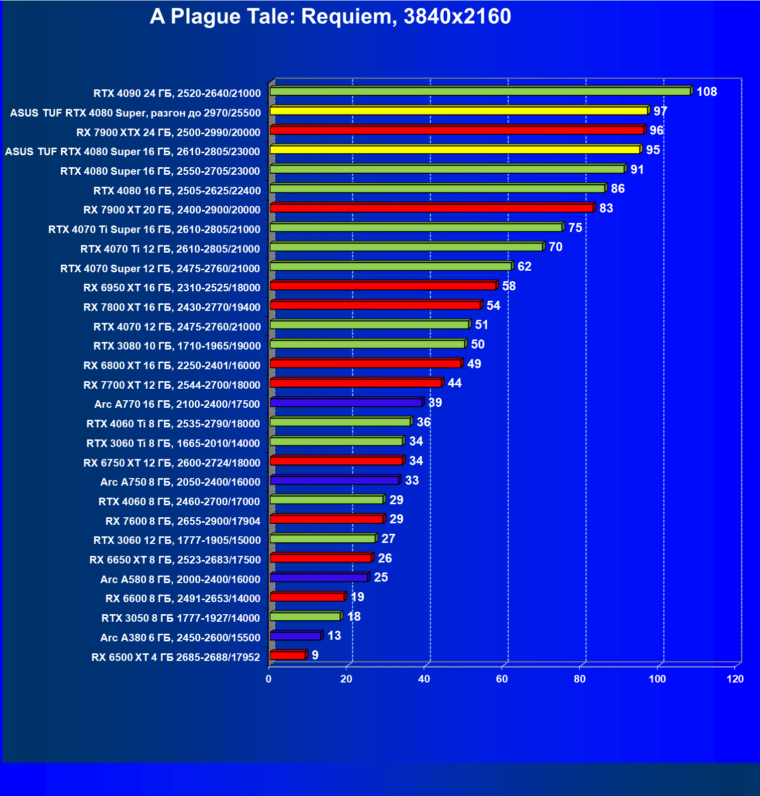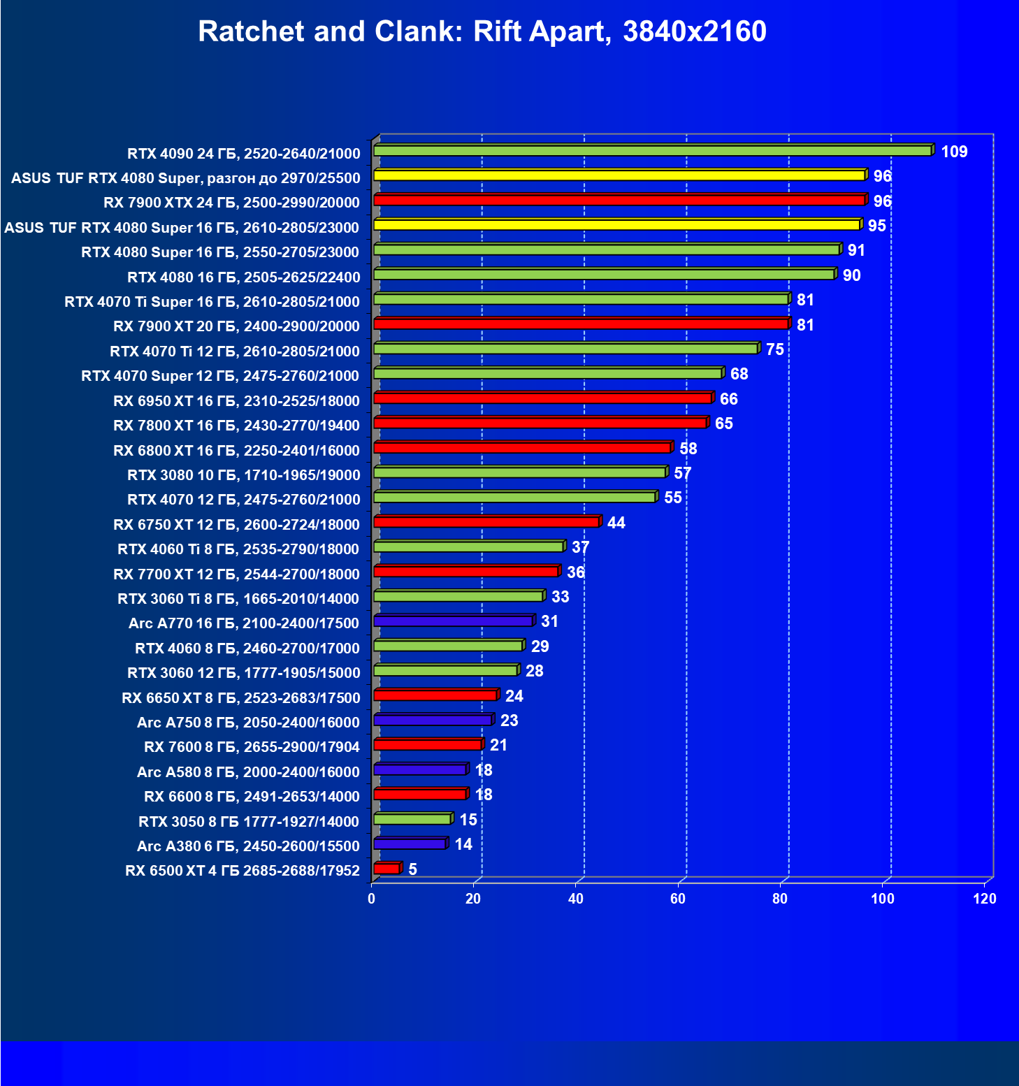 | 08 | RX 7900 XTX 24 ГБ, 2500—2990/20000 | 2163 | 219 | 99 000 |