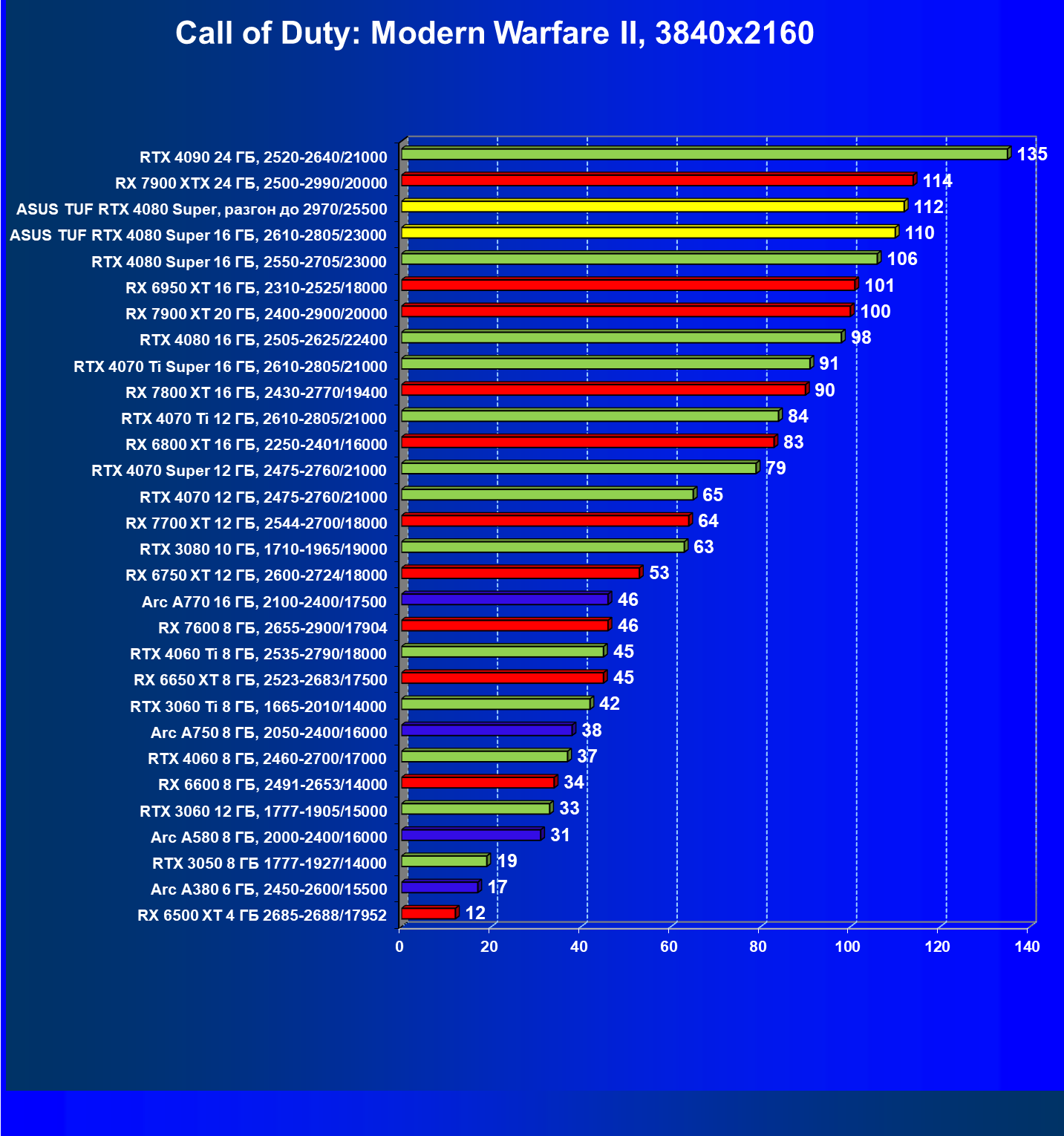 | 23 | RTX 4080 Super 16 ГБ, 2550—2705/23000 | 134 | 1671 | 125 000 |