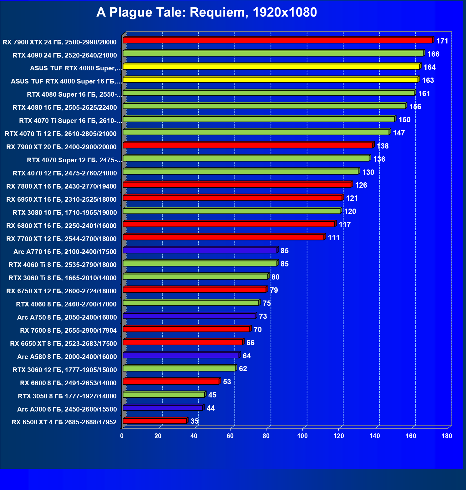 | 12 | RX 7900 XTX 24 ГБ, 2500—2990/20000 | 172 | 1702 | 99 000 |
