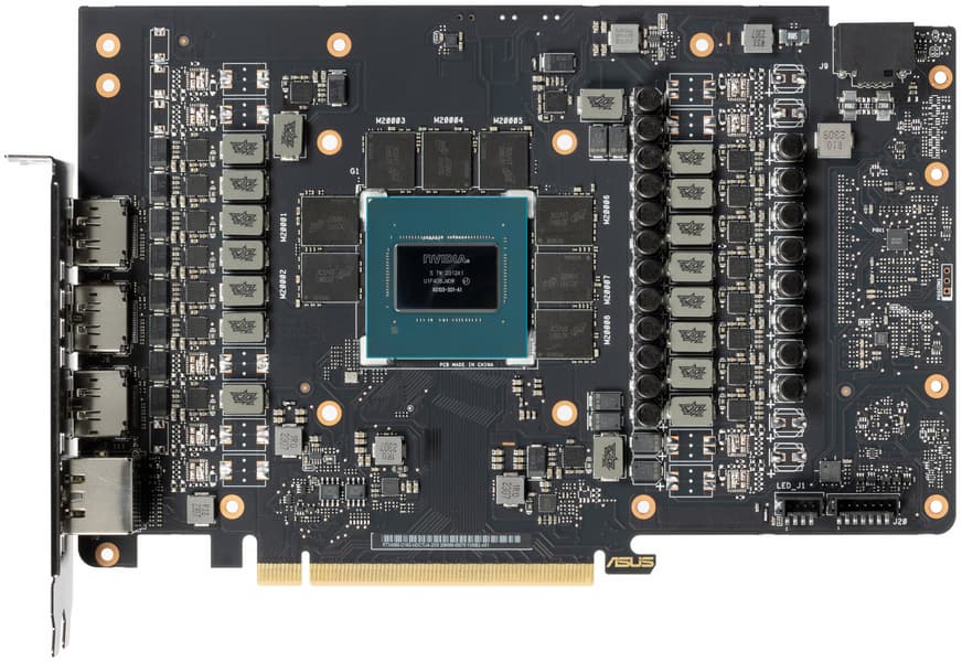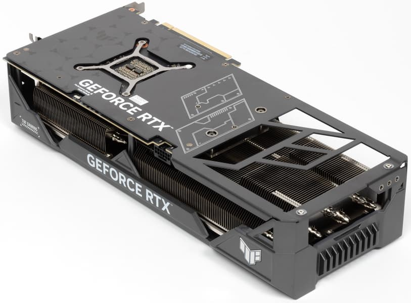 Карта Asus способна потреблять до 307 Вт (разовые всплески могут быть выше). Система охлаждения мощная, эффективная и достаточно тихая. Габариты видеокарты составляют 35 см в длину и 15 см в высоту, а по толщине она занимает 4 слота в корпусе. Набор видеовыходов — 3 DP и 2 HDMI.