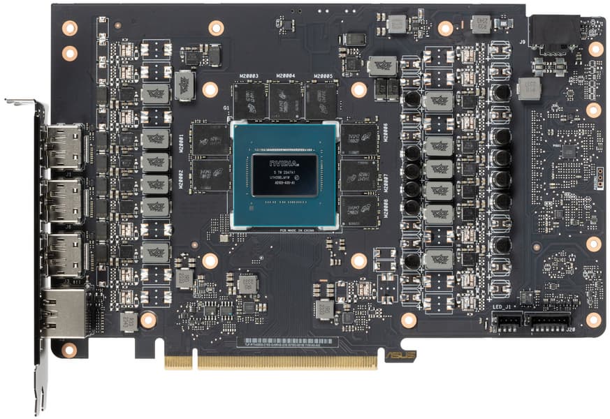 Карта имеет 16 ГБ памяти GDDR6X SDRAM, размещенной в 8 микросхемах по 16 Гбит на лицевой стороне PCB. Микросхемы памяти Micron (MT61K512M32KPA-24 / D8BZF) рассчитаны на номинальную частоту работы в 3000 (24000) МГц.