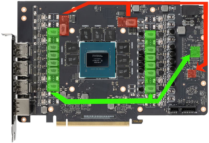 Зеленым цветом отмечена схема питания ядра, красным — памяти. Все ШИМ-контроллеры расположены на лицевой стороне PCB.