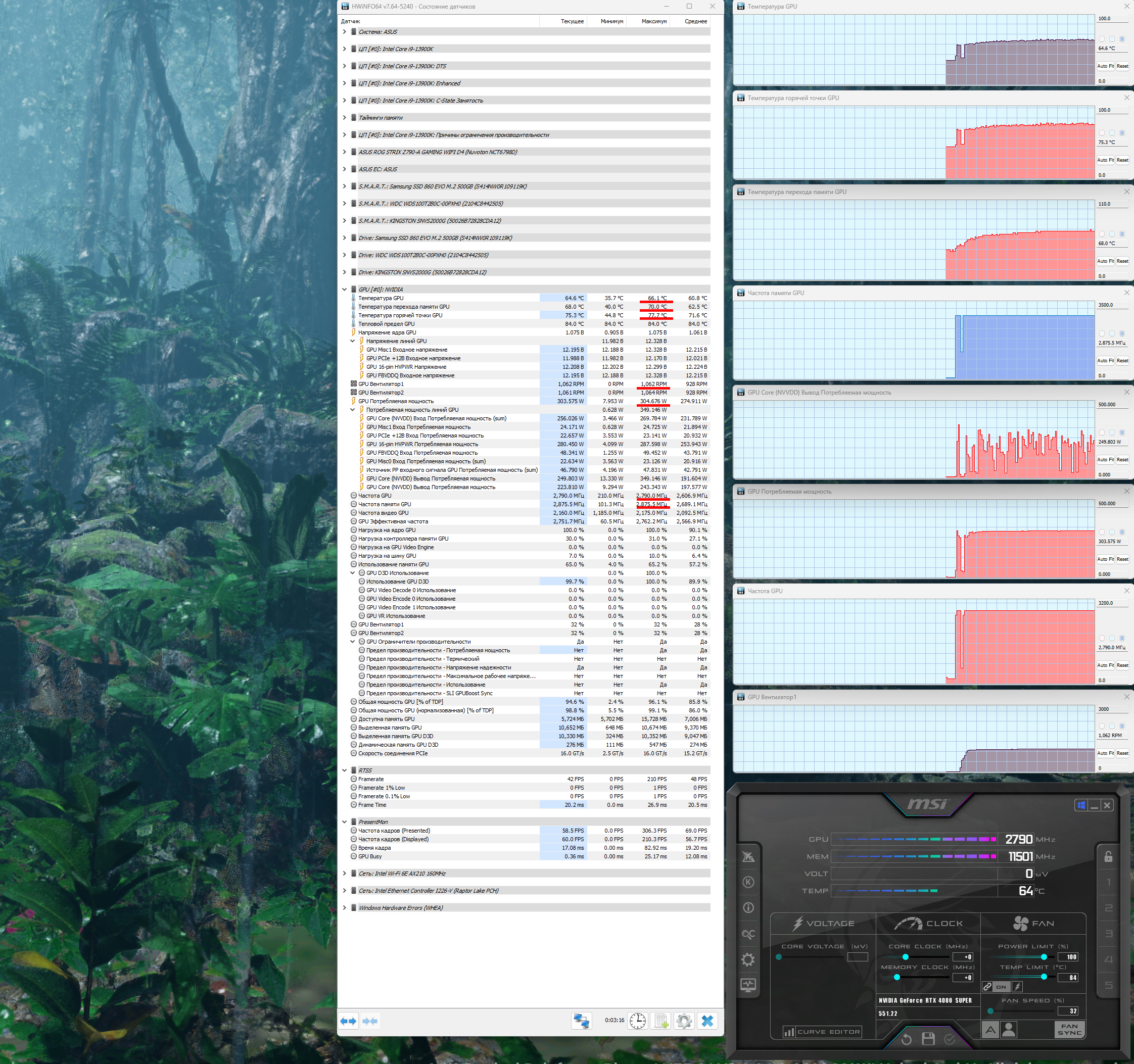 При ручном разгоне параметры нагрева и шума менялись мало (66/66 °С), но максимальное потребление выросло до 328 Вт (пиковое 349 Вт), прибавилось 5,5% производительности, при этом температура самой горячей точки ГП (hot spot) составляла 79 °C.