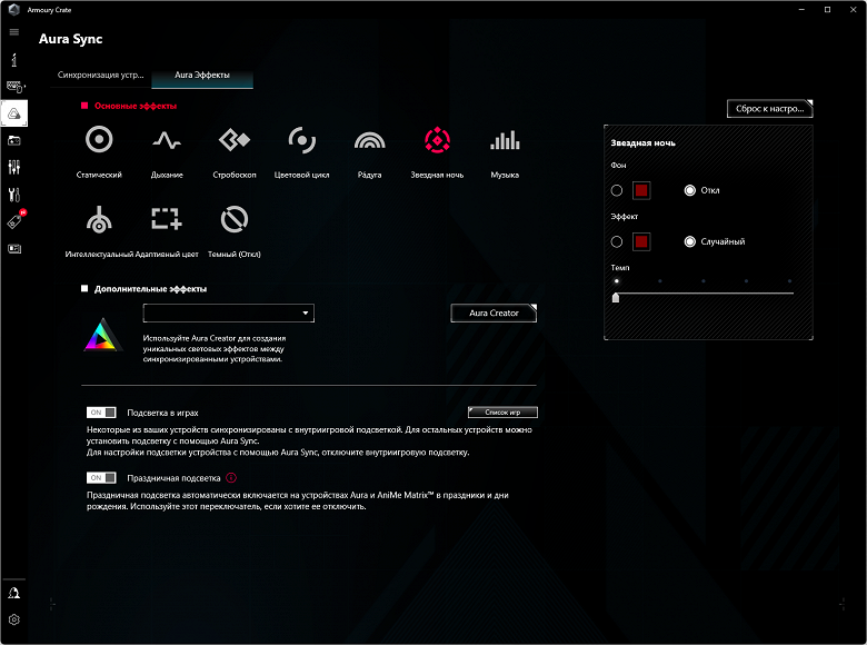 Управление подсветкой традиционно выполнено с помощью фирменной программы Asus — Armoury Crate