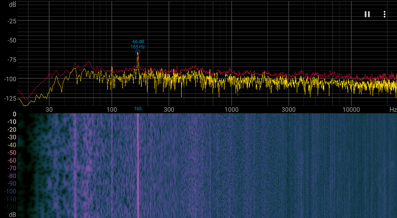 Спектрограмма шума достаточно ровная, но есть выраженный пик на 165 Гц.