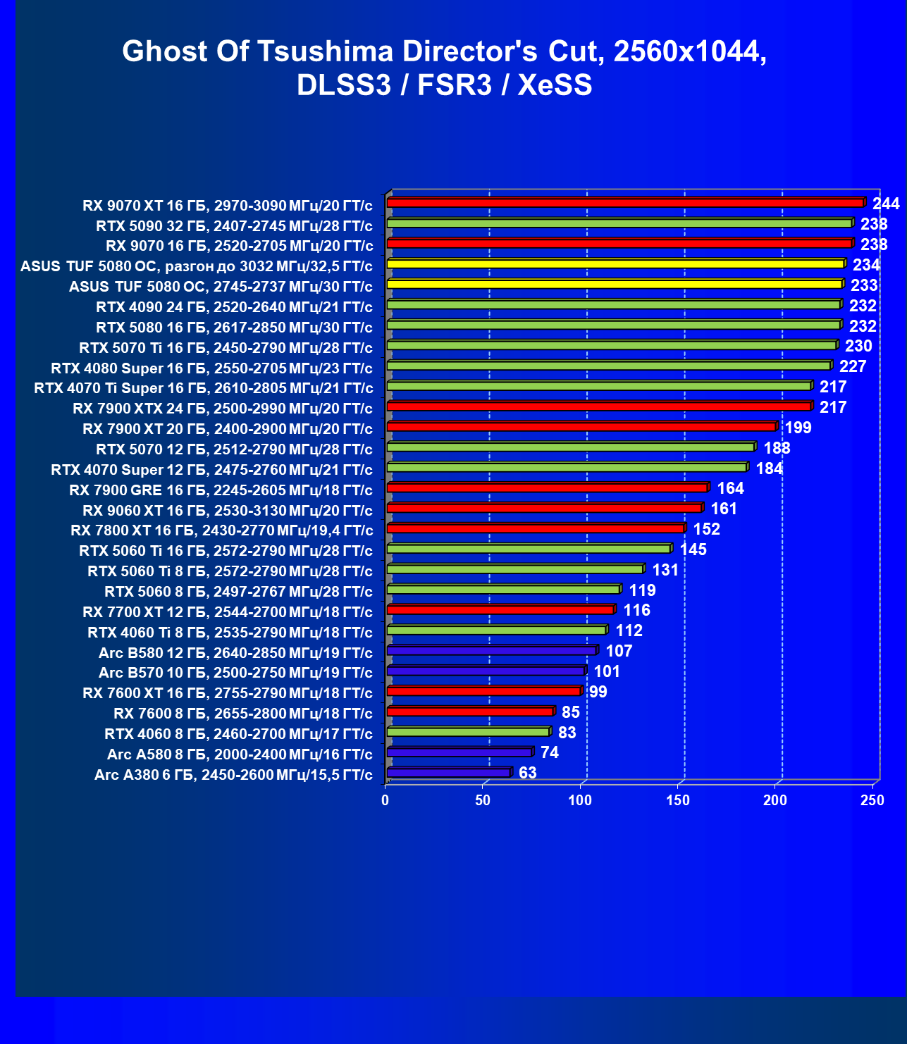 | 05 | RX 9070 XT 16 ГБ, 2970—3090 МГц/20 ГТ/с | 1078 | 7979 | 74 000 |