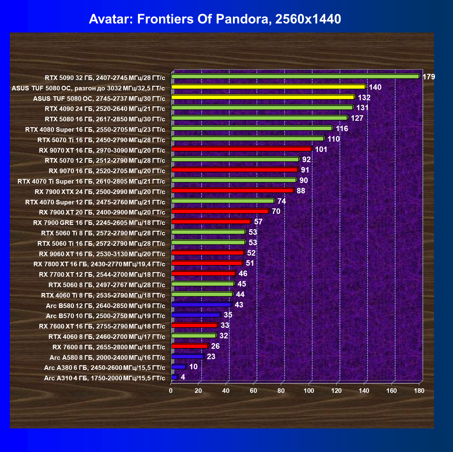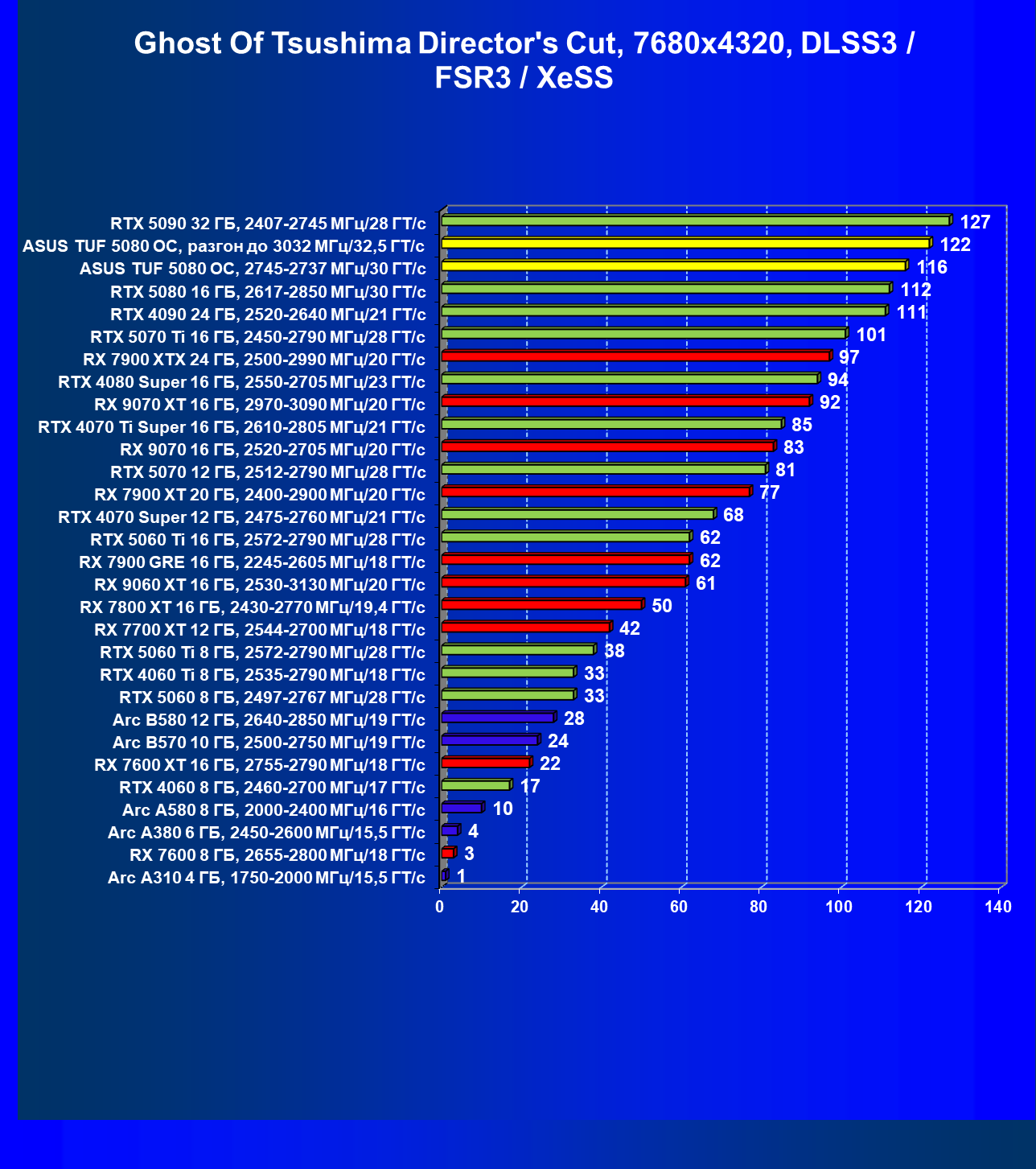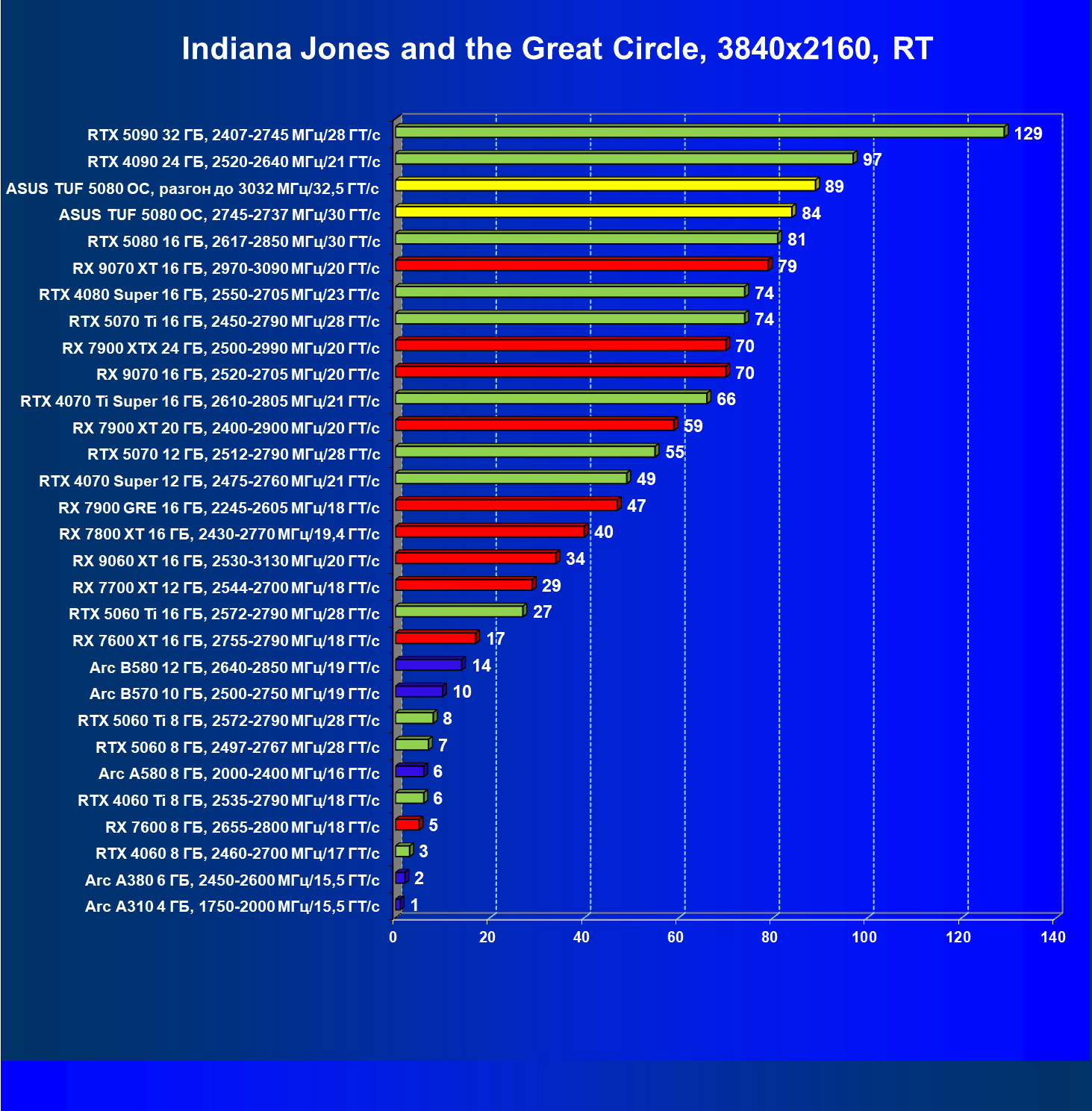 | 26 | RX 7900 XTX 24 ГБ, 2500—2990 МГц/20 ГТ/с | 475 | 5979 | 126 000 |