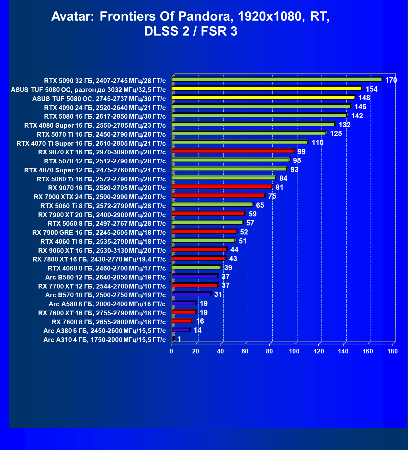 | 08 | RX 9070 XT 16 ГБ, 2970—3090 МГц/20 ГТ/с | 7979 | 1078 | 74 000 |