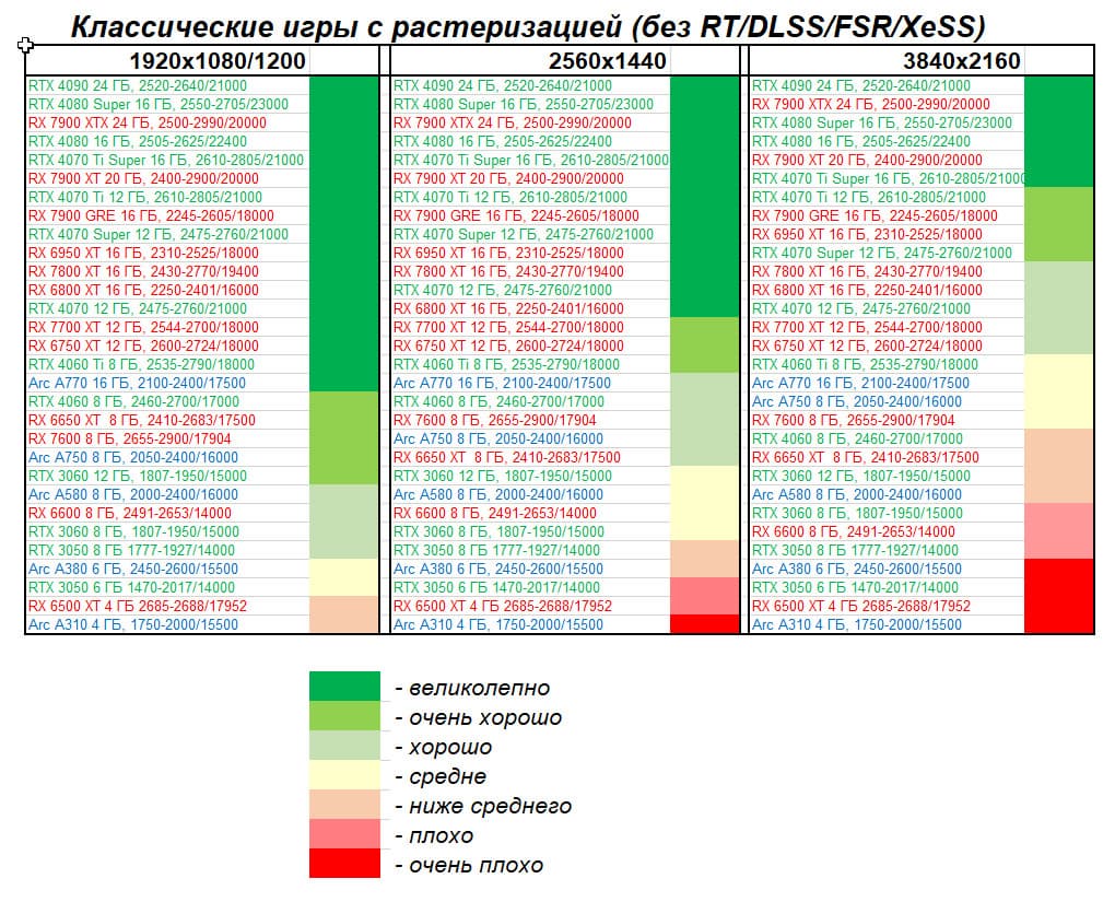 Мы видим, что в классических играх без RT и технологий масштабирования референс-карта Radeon RX 7900 XT чуть-чуть опередила GeForce RTX 4070 Ti Super, но даже ручной разгон карты Asus не помог ей приблизиться к GeForce RTX 4080, при этом цена карты Asus оказалась выше минимальной цены GeForce RTX 4080 на момент подготовки обзора.