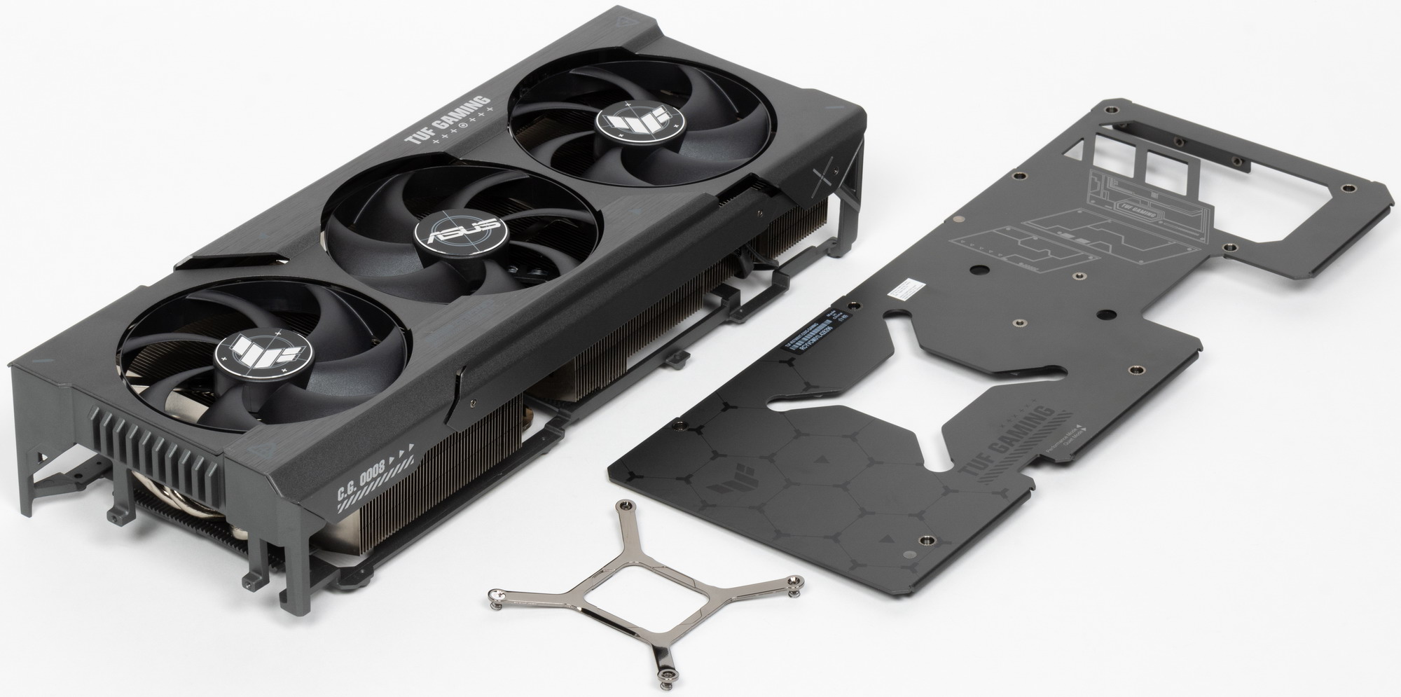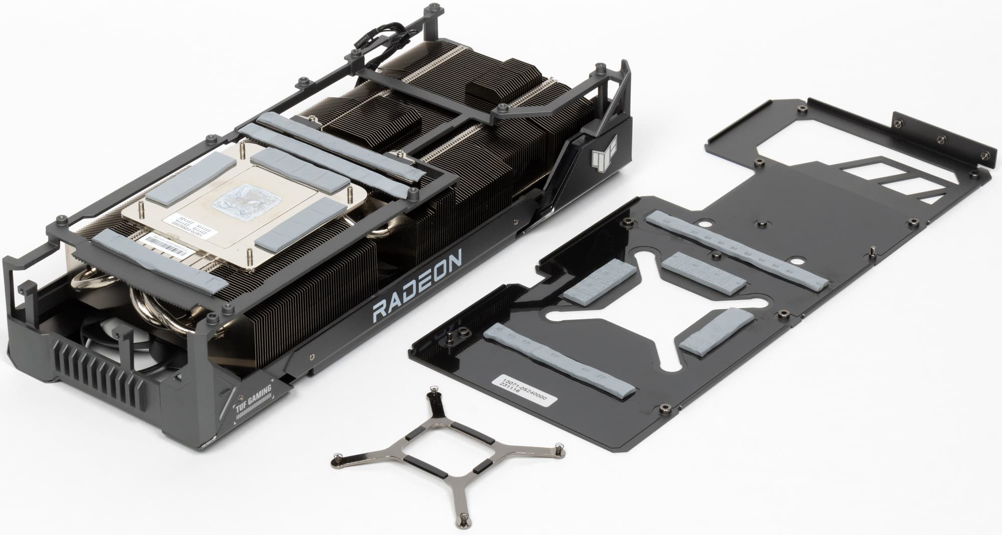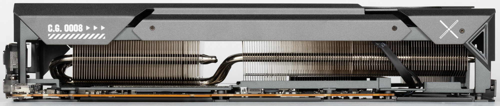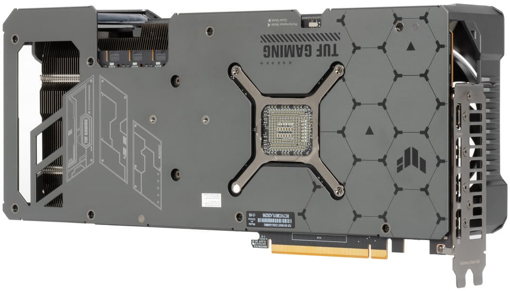 Задняя пластина не только служит элементом защиты PCB, но и участвует в охлаждении оборотной стороны платы через термопрокладки, которые отводят тепло в зонах микросхем памяти и VRM. Также пластина оснащена большими вырезами для лучшего сквозного продува радиатора.