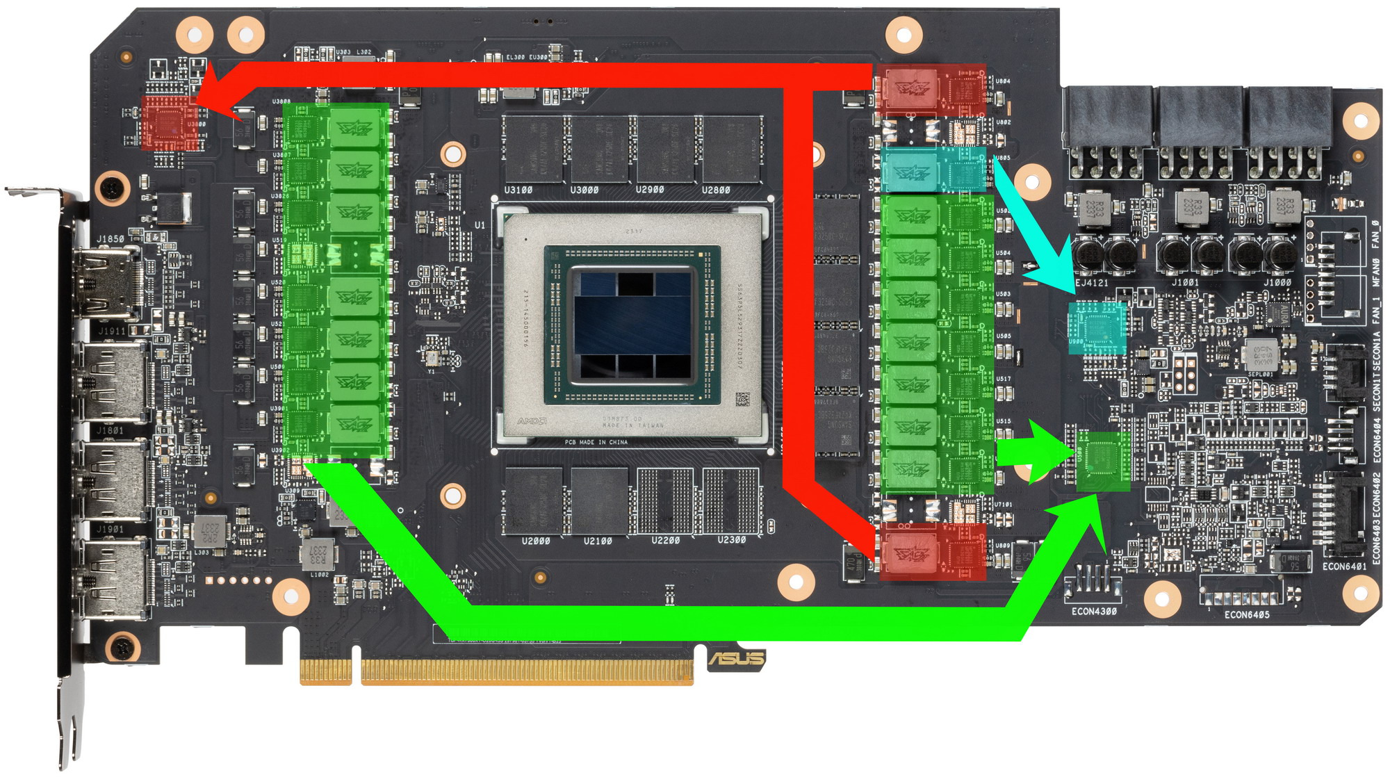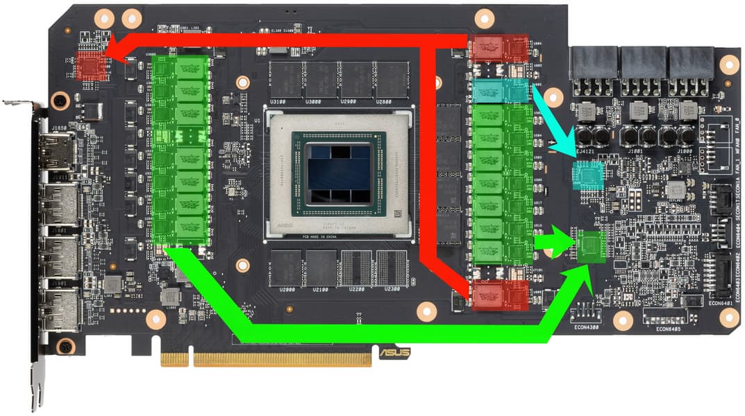 Суммарное количество фаз питания у карты Asus и у референс-карты одинаковое — по 17.