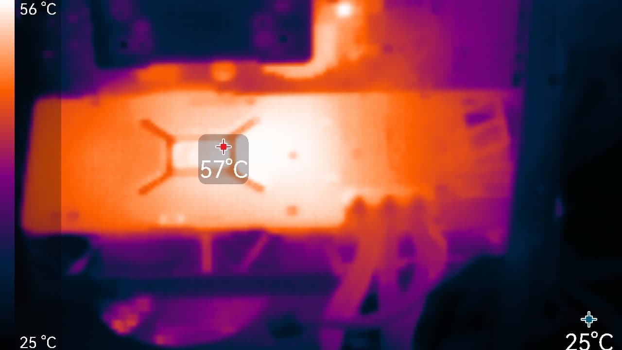 После 2-часового прогона под нагрузкой в режиме Performance максимальная температура ядра не превысила 56 градусов, а памяти — 80 °C, что является отличным результатом для видеокарт флагманского уровня. Энергопотребление карты доходило почти до 329 Вт, а вентиляторы работали на уровне 1327 об/мин. Температура нагрева самой горячей точки ГП (hot spot) составляла 73 °C.