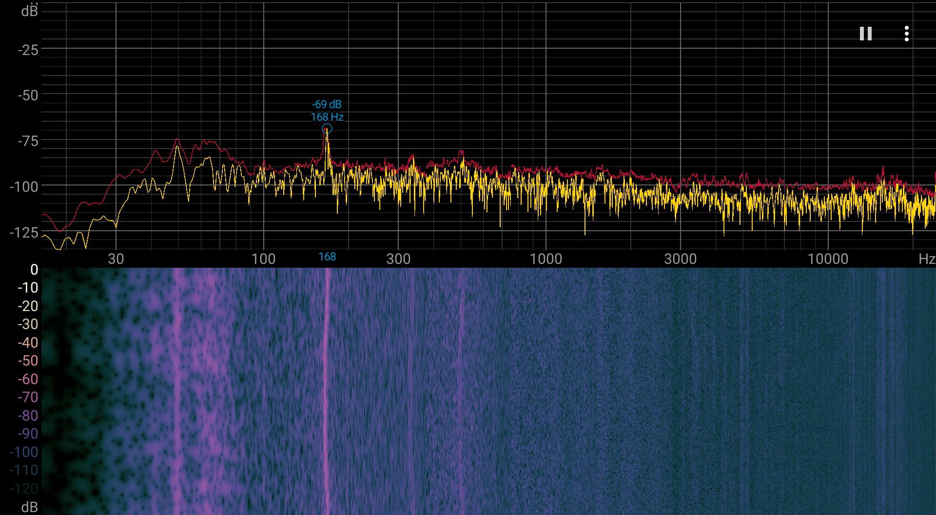 Спектрограмма шума достаточно «чистая», но есть выраженный пик на 168 Гц.