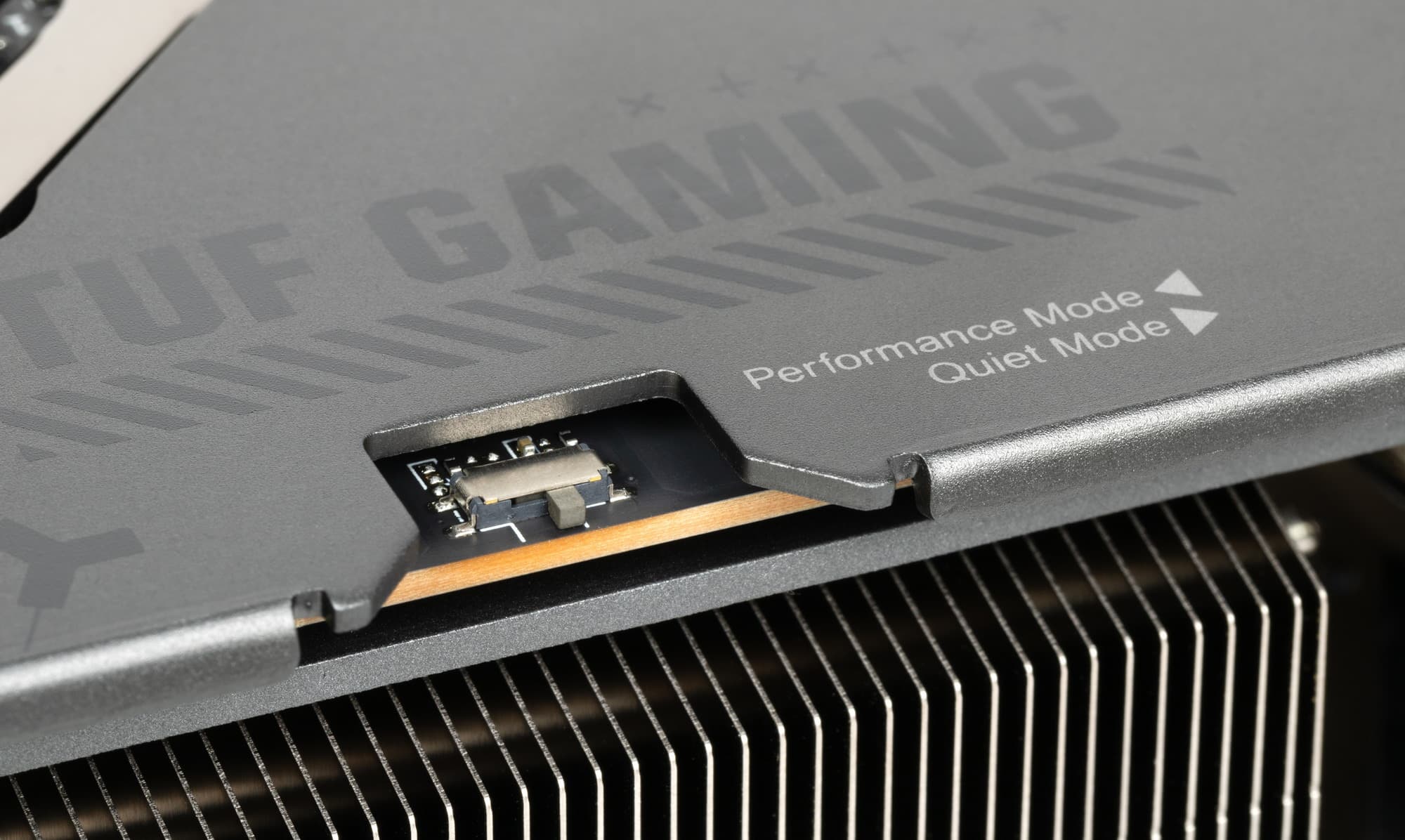 Карта имеет двойной BIOS, что уже традиционно для топовых решений Asus. На торце карты есть переключатель версий BIOS (они названы Performance mode (PMode) и Quiet mode (QMode) — производительный и тихий режимы). Разница между режимами заключается, по сути, только в оборотах вентиляторов (частота работы ядра отличается минимально).