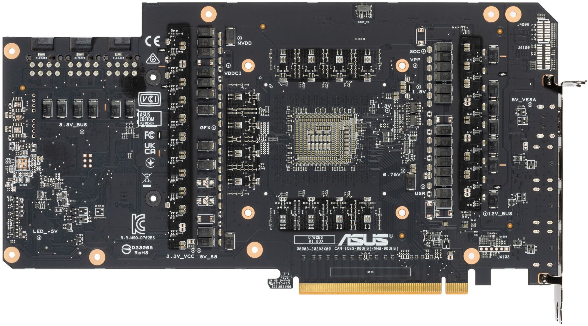 Мы логично сравниваем карту Asus с референсной картой AMD. Прекрасно видно, что по длине PCB практически равны, но карта Asus значительно выше из-за большего количества посадочных мест под фазы питания, а также из-за необходимости разместить переключатель версий BIOS (ну, и для более надежного крепления весьма громоздкой СО).