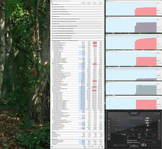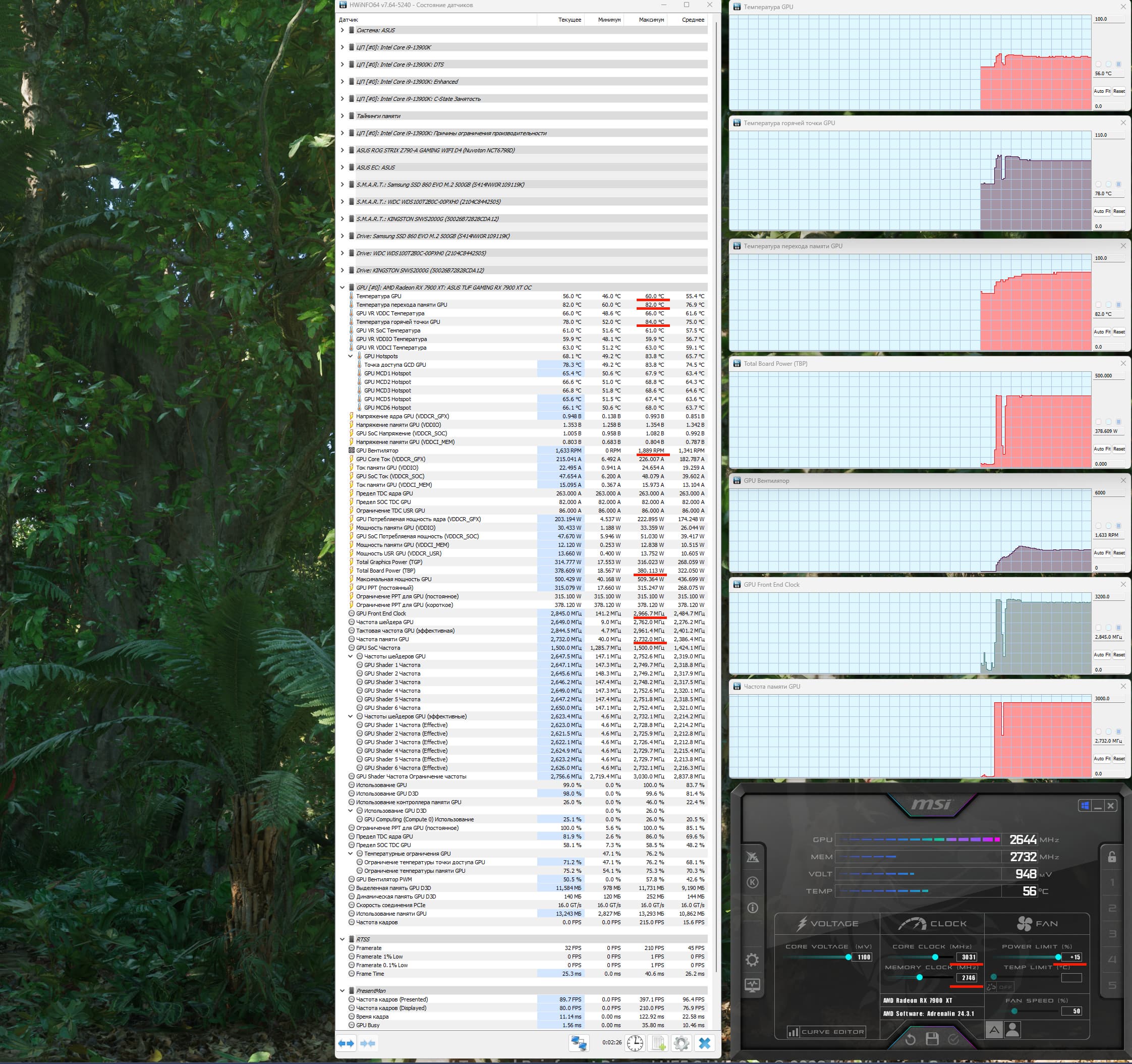 При ручном разгоне параметры нагрева и шума менялись мало (60/82 °С), но максимальное потребление выросло до 380 Вт, прибавилось 4% производительности, при этом температура самой горячей точки ГП (hot spot) составляла 84 °C.