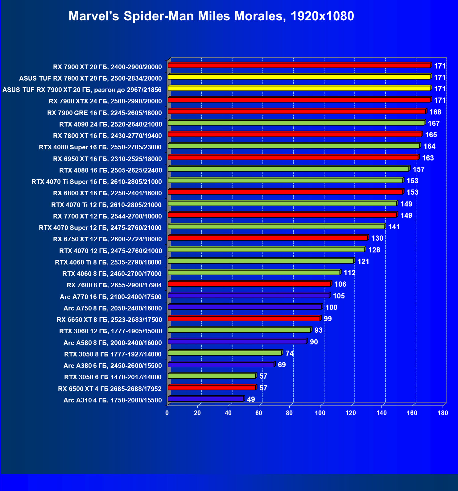 | 07 | RX 7900 XT 20 ГБ, 2400—2900/20000 | 2365 | 249 | 95 000 |