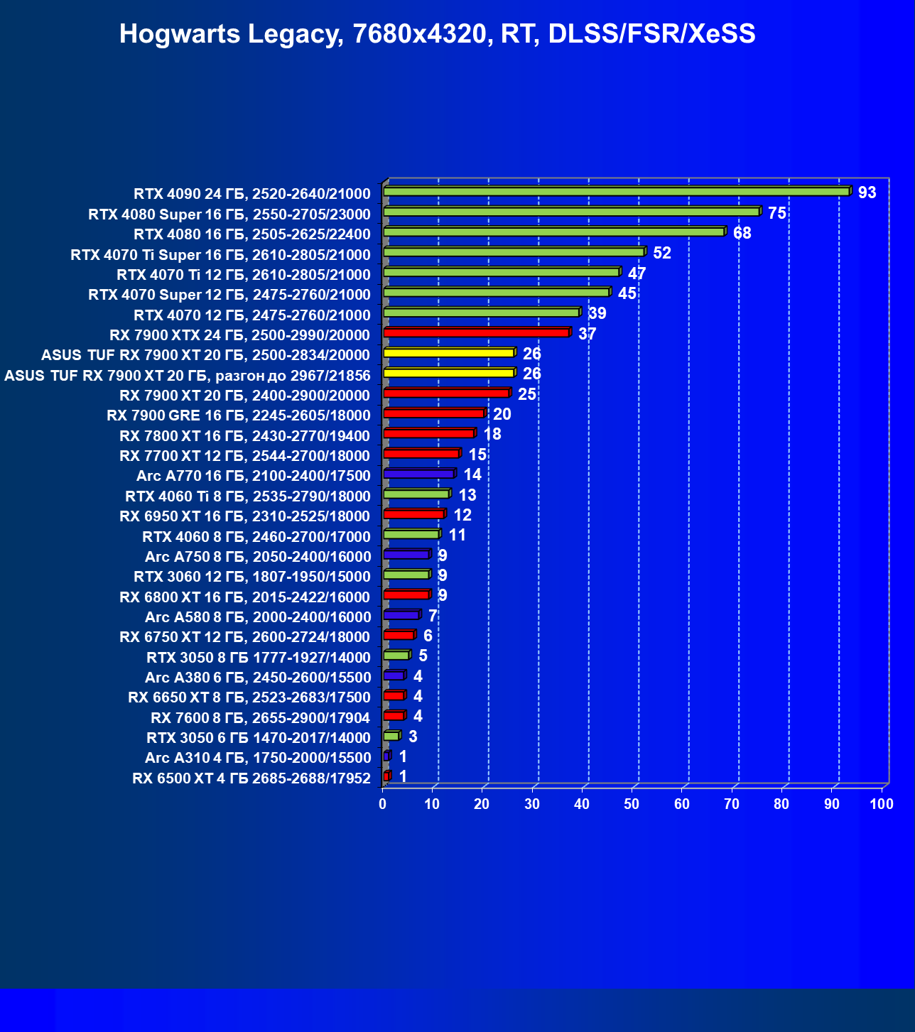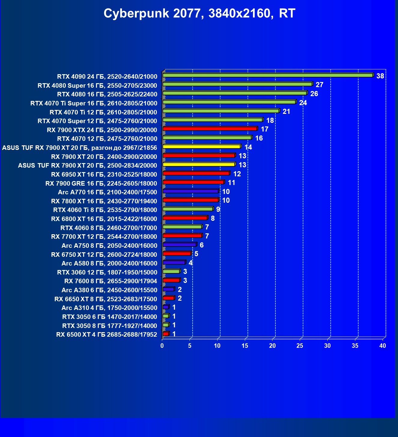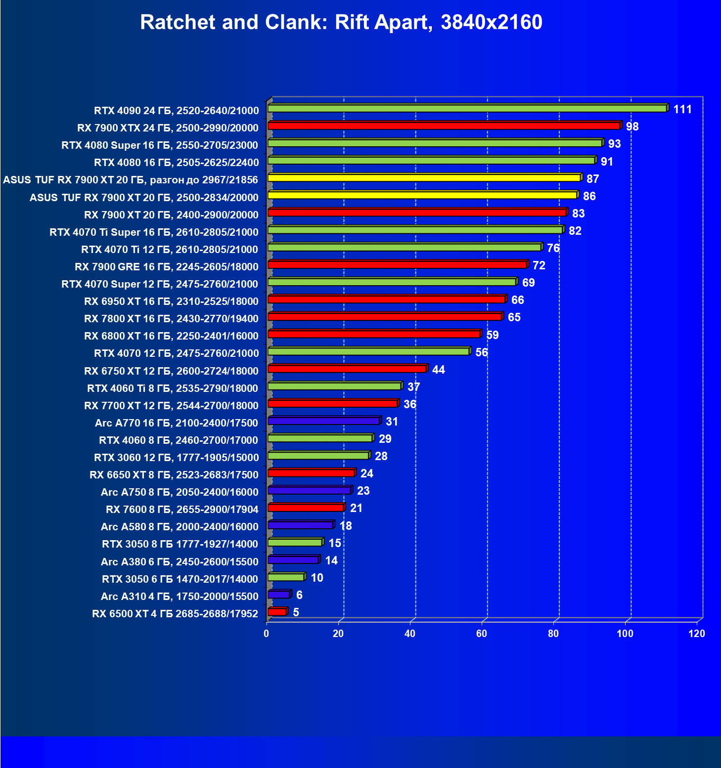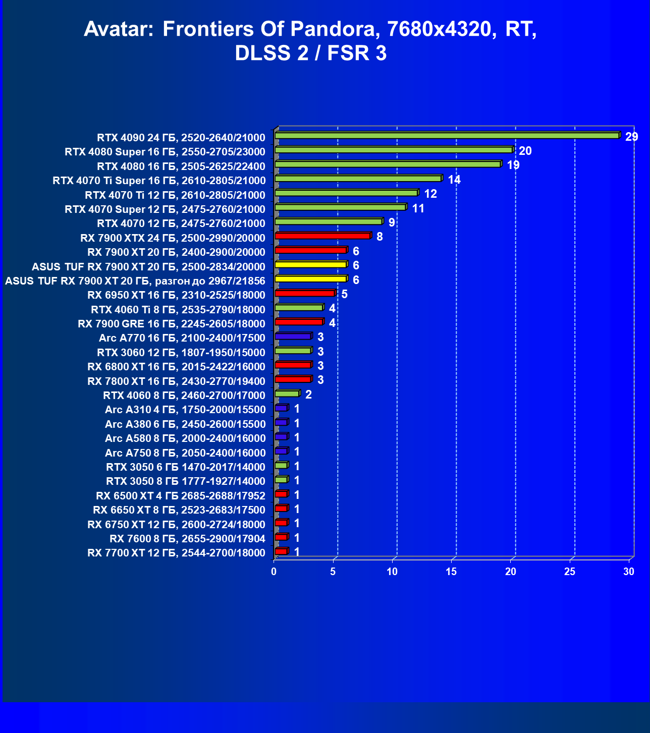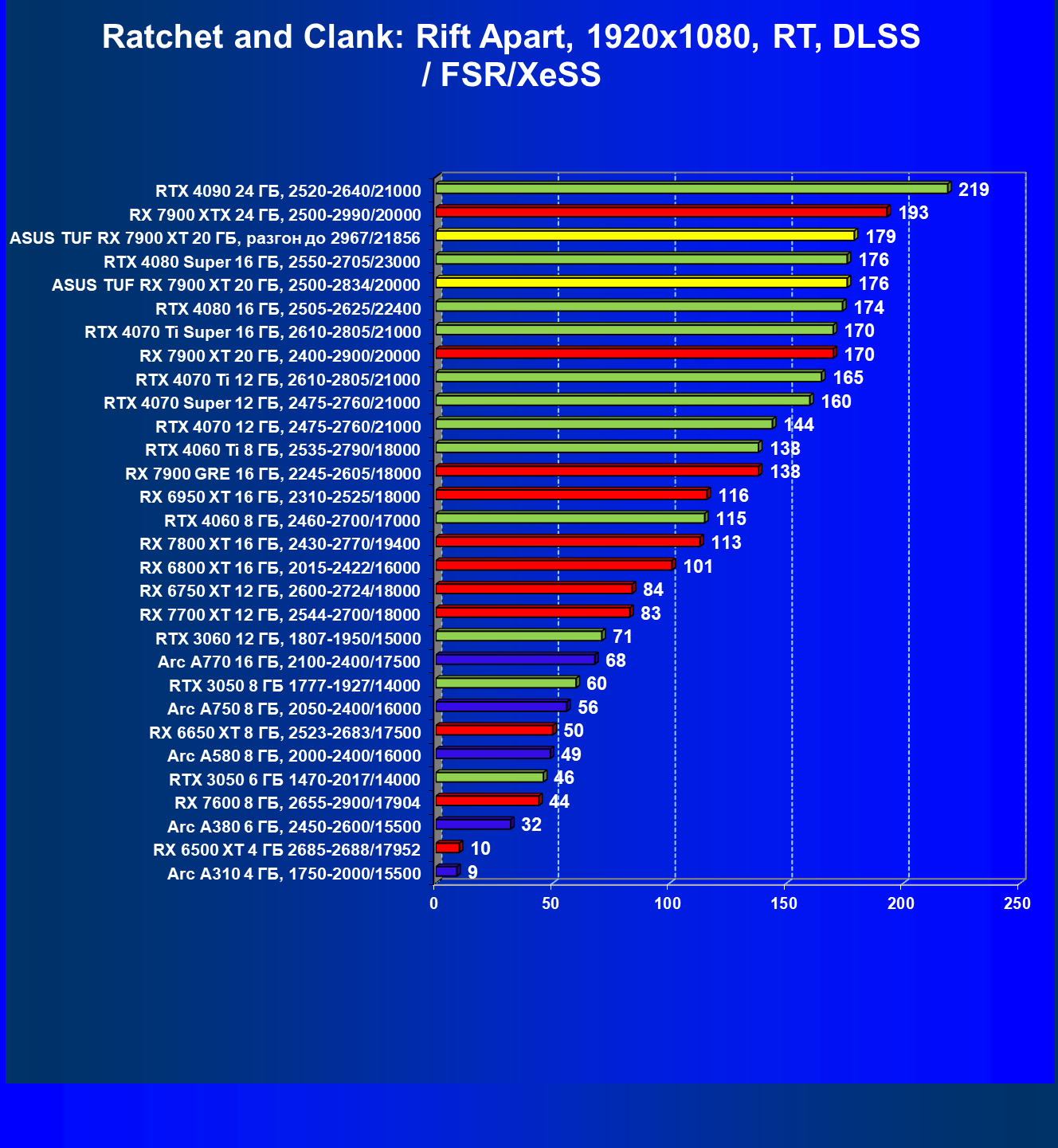 | 24 | Asus TUF RX 7900 XT 20 ГБ, разгон до 2967/21856 | 218 | 2483 | 114 000 |