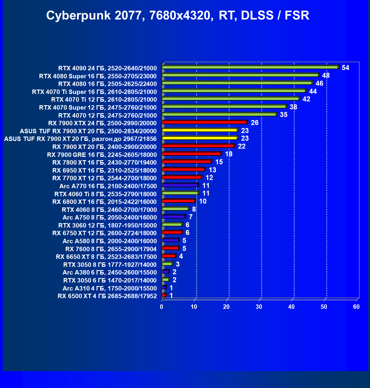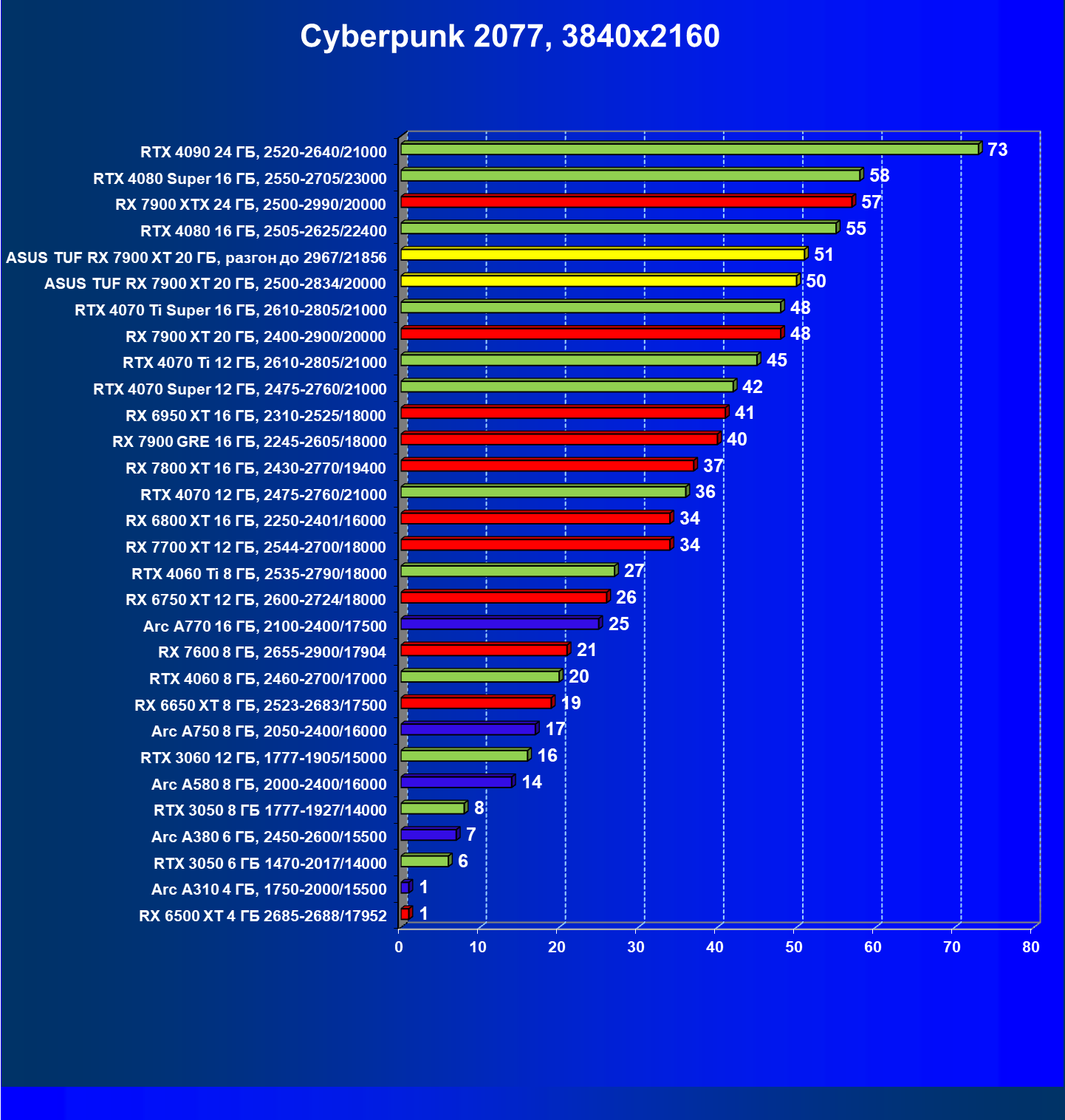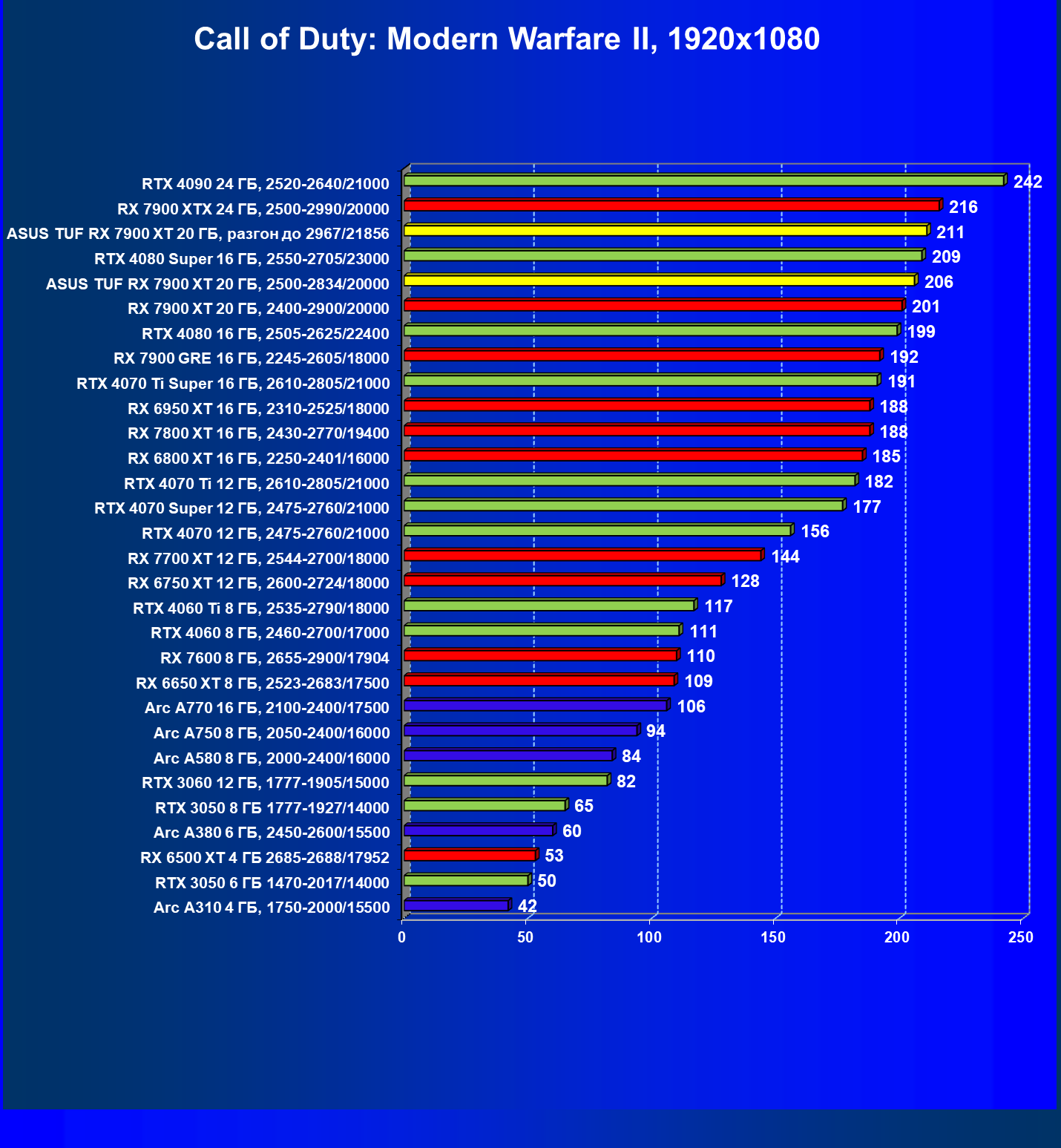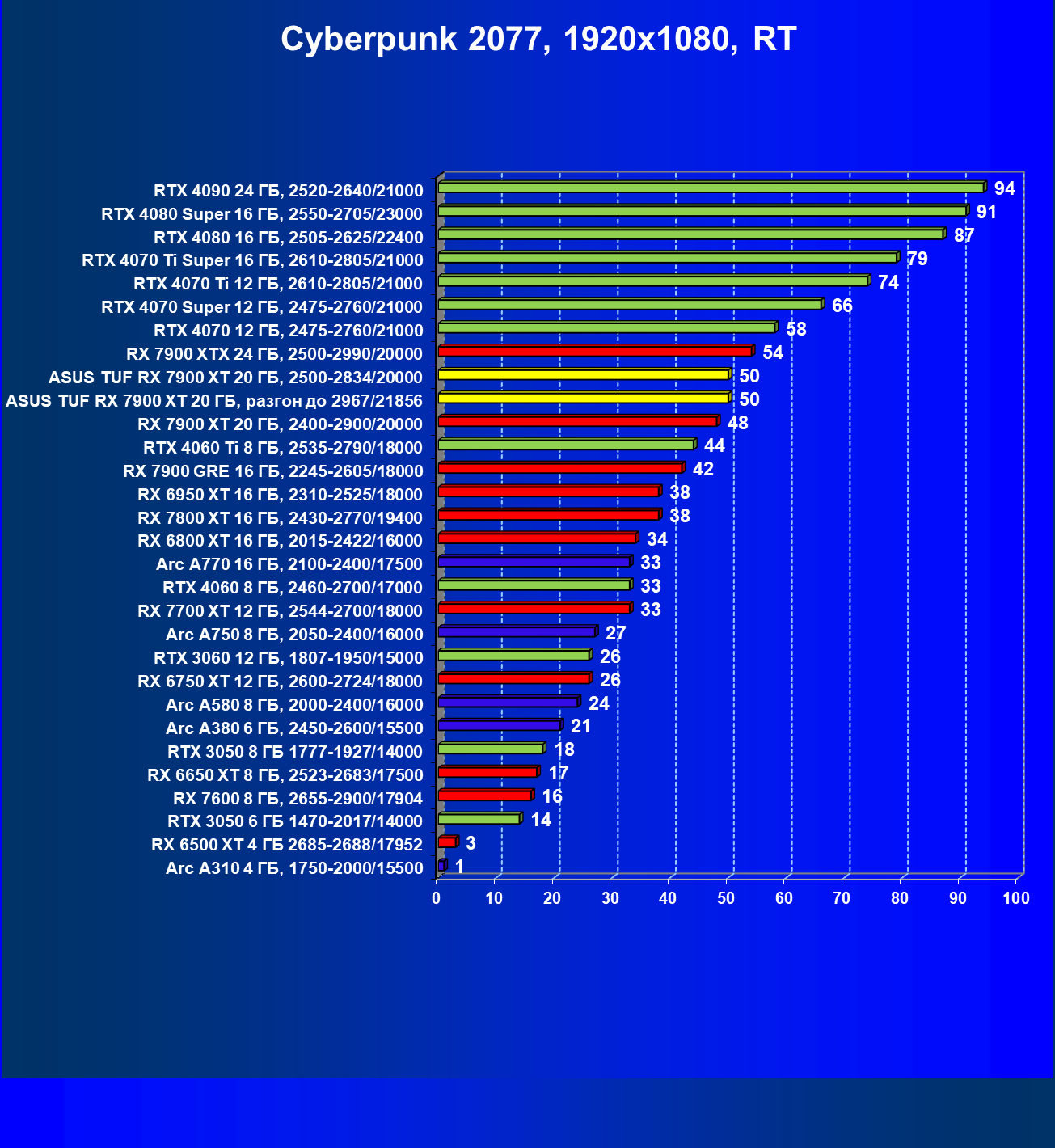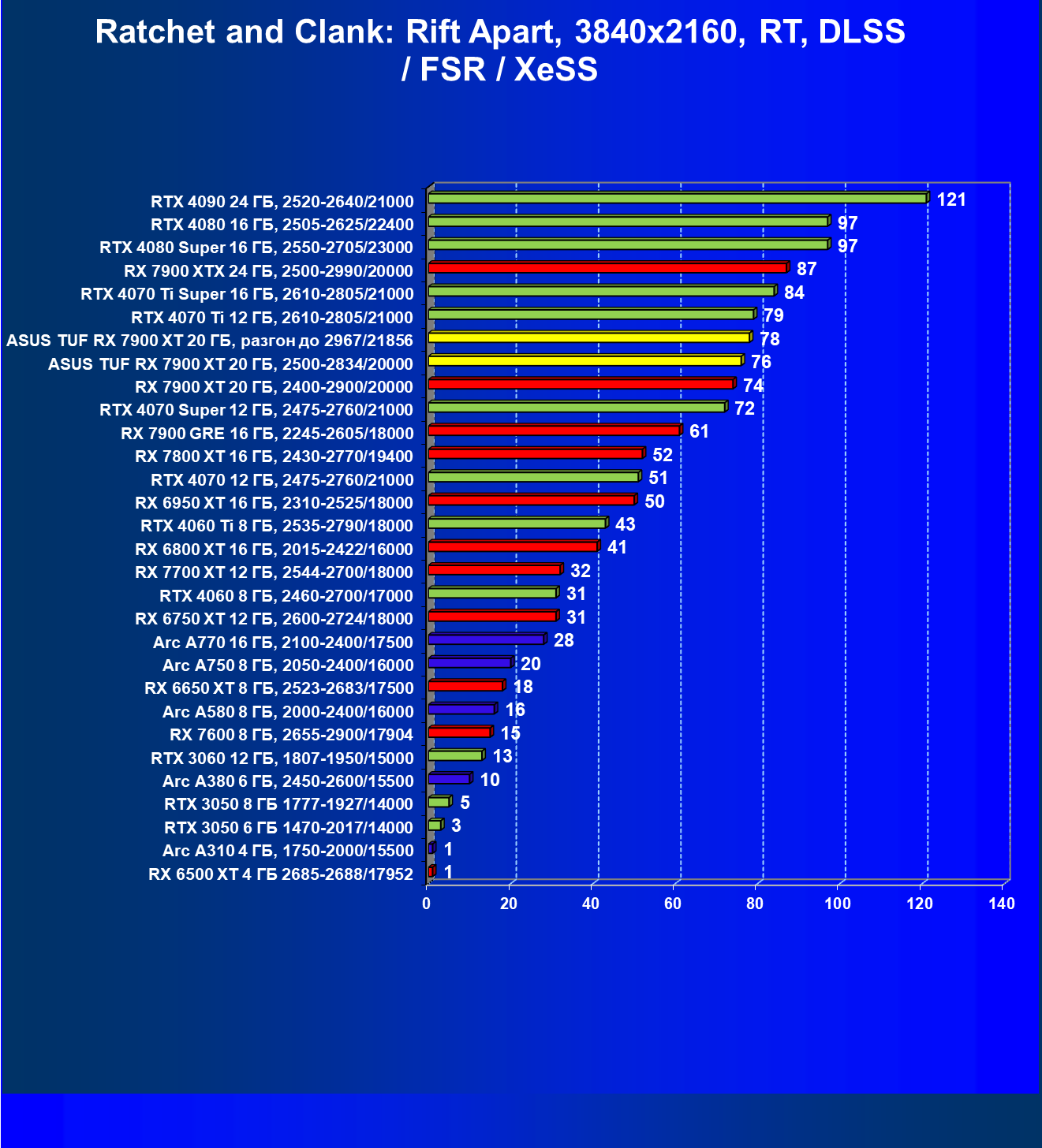 | 24 | Asus TUF RX 7900 XT 20 ГБ, разгон до 2967/21856 | 218 | 2483 | 114 000 |