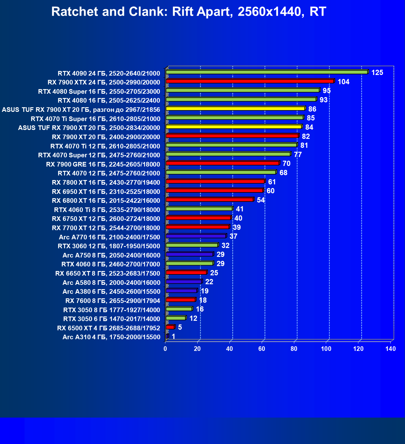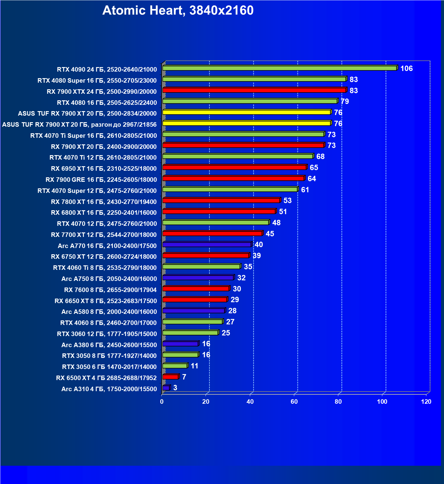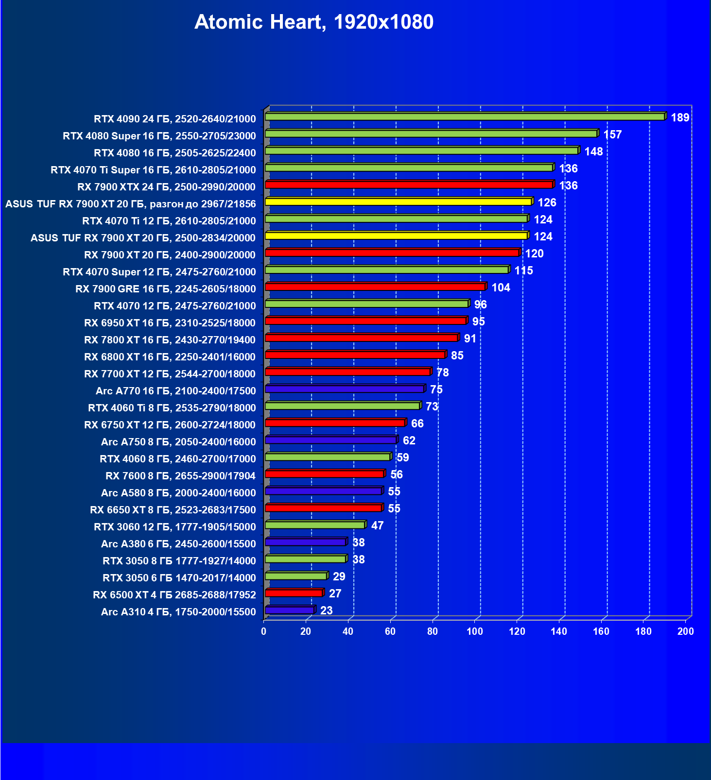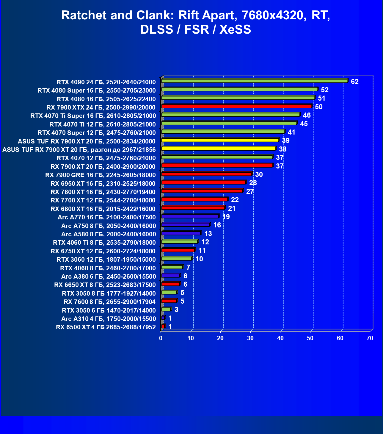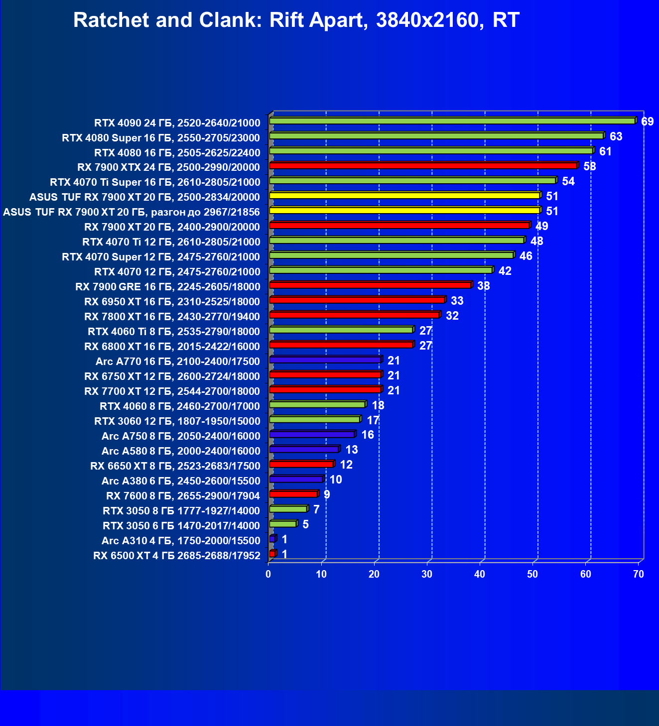 | 24 | Asus TUF RX 7900 XT 20 ГБ, разгон до 2967/21856 | 218 | 2483 | 114 000 |