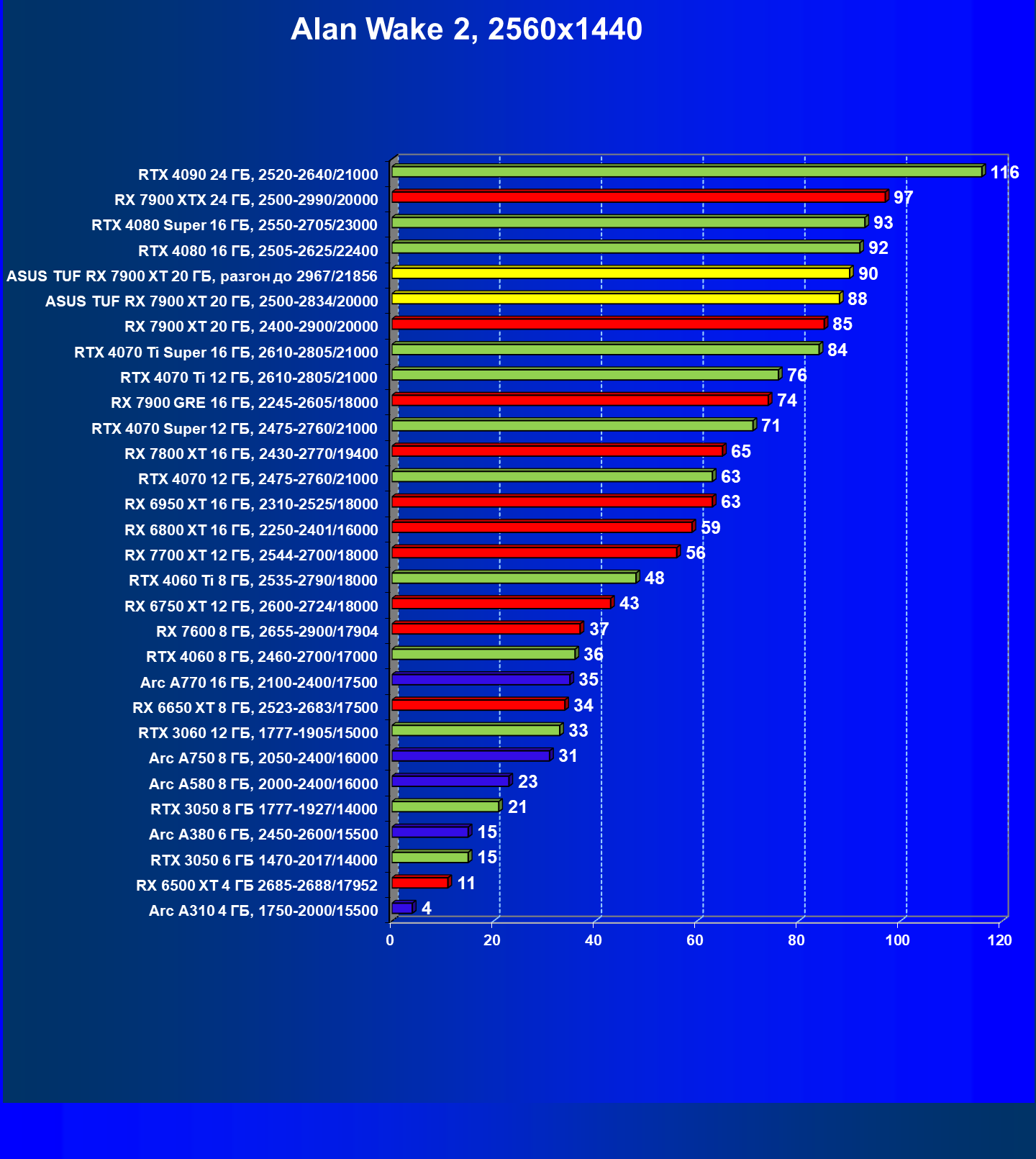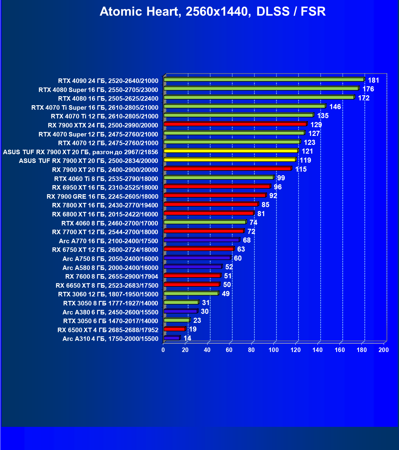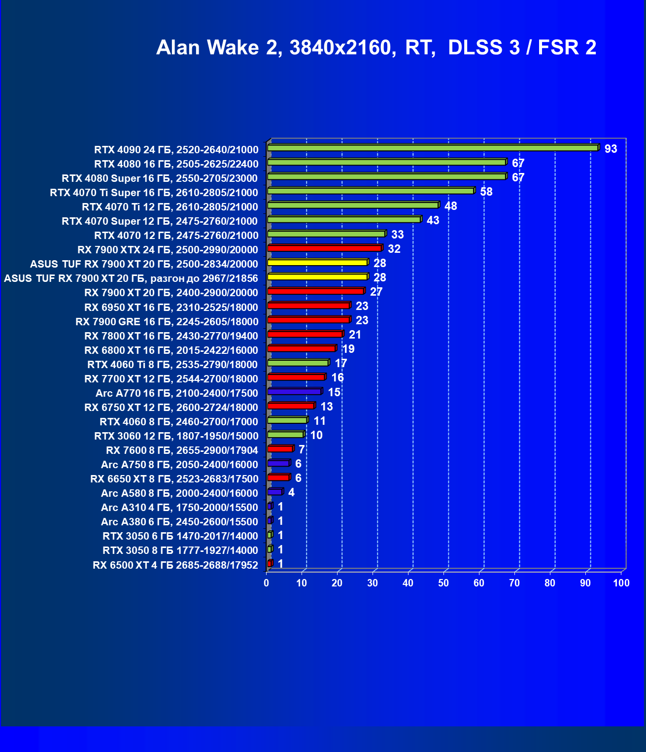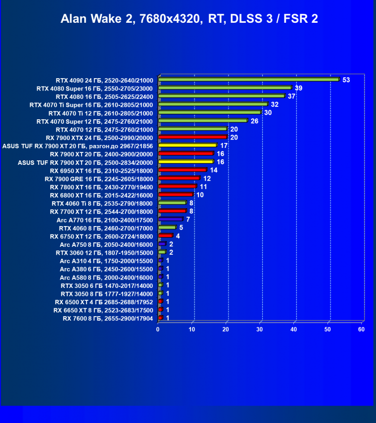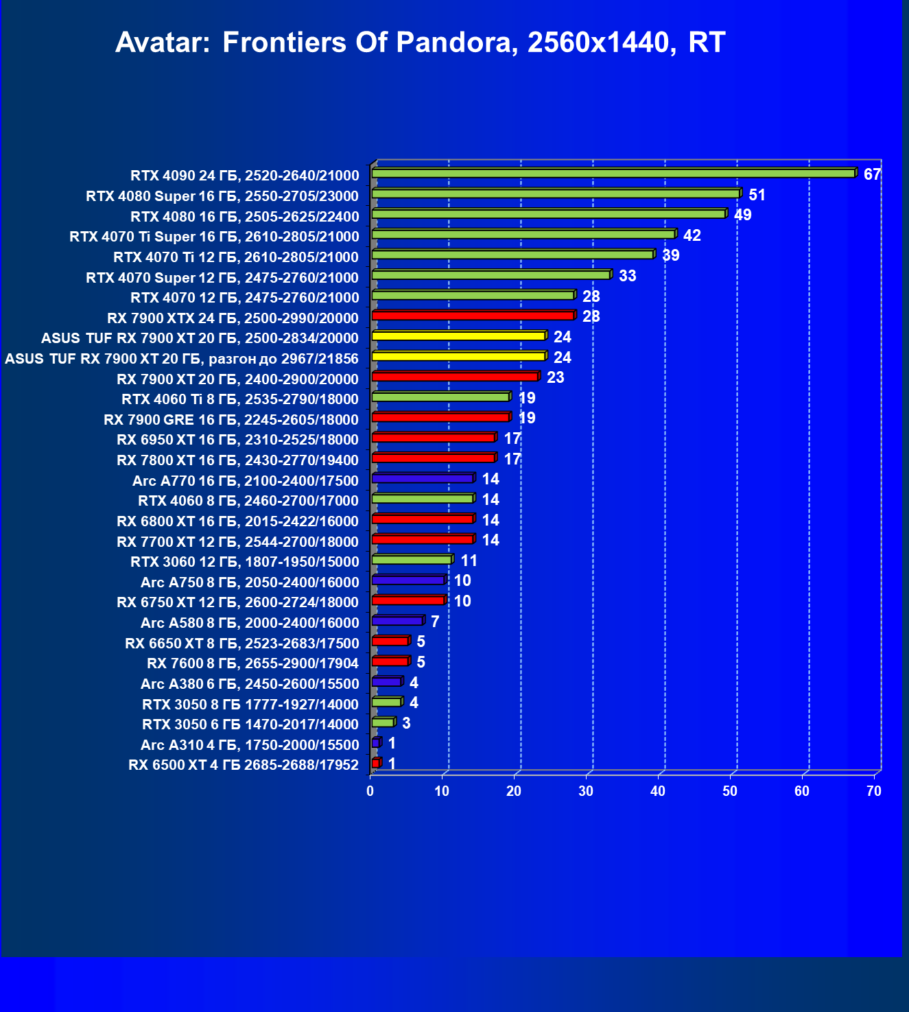| 24 | Asus TUF RX 7900 XT 20 ГБ, разгон до 2967/21856 | 218 | 2483 | 114 000 |