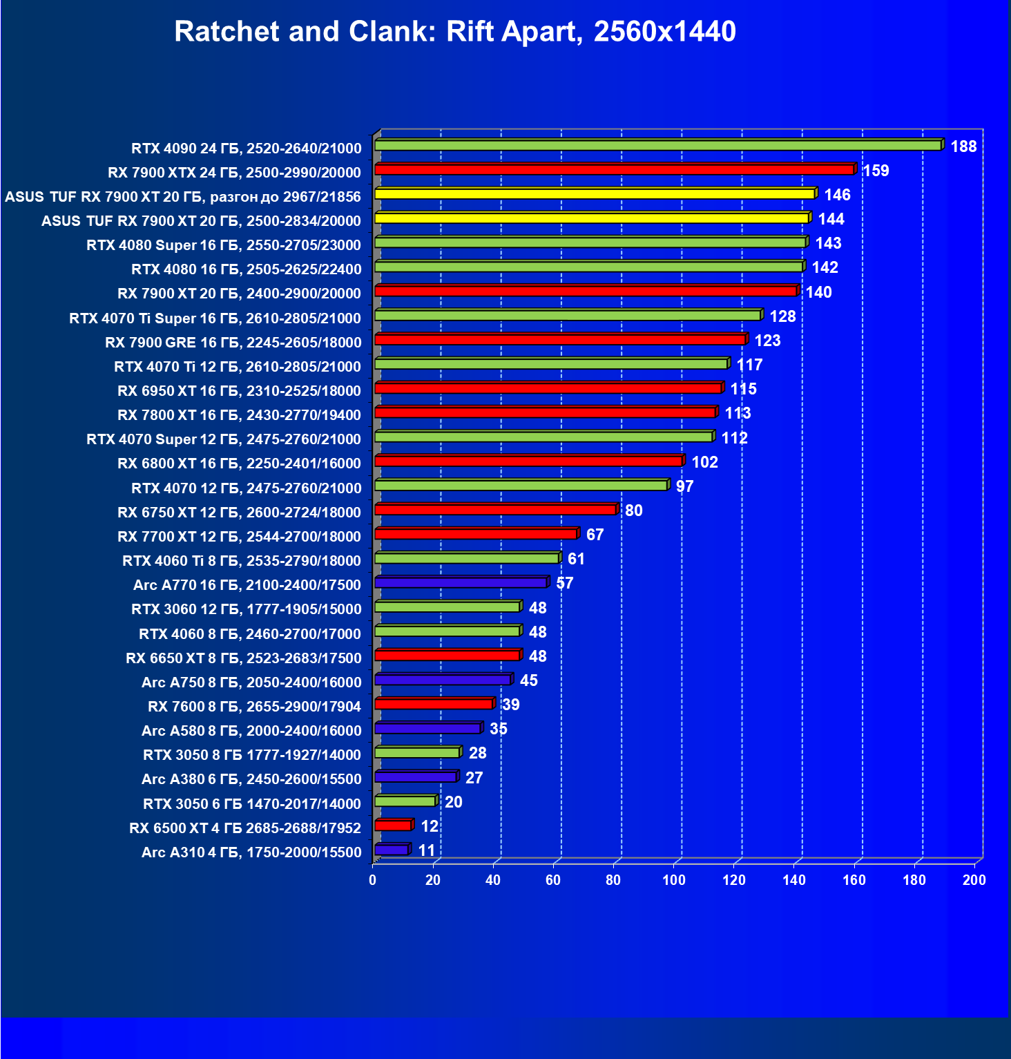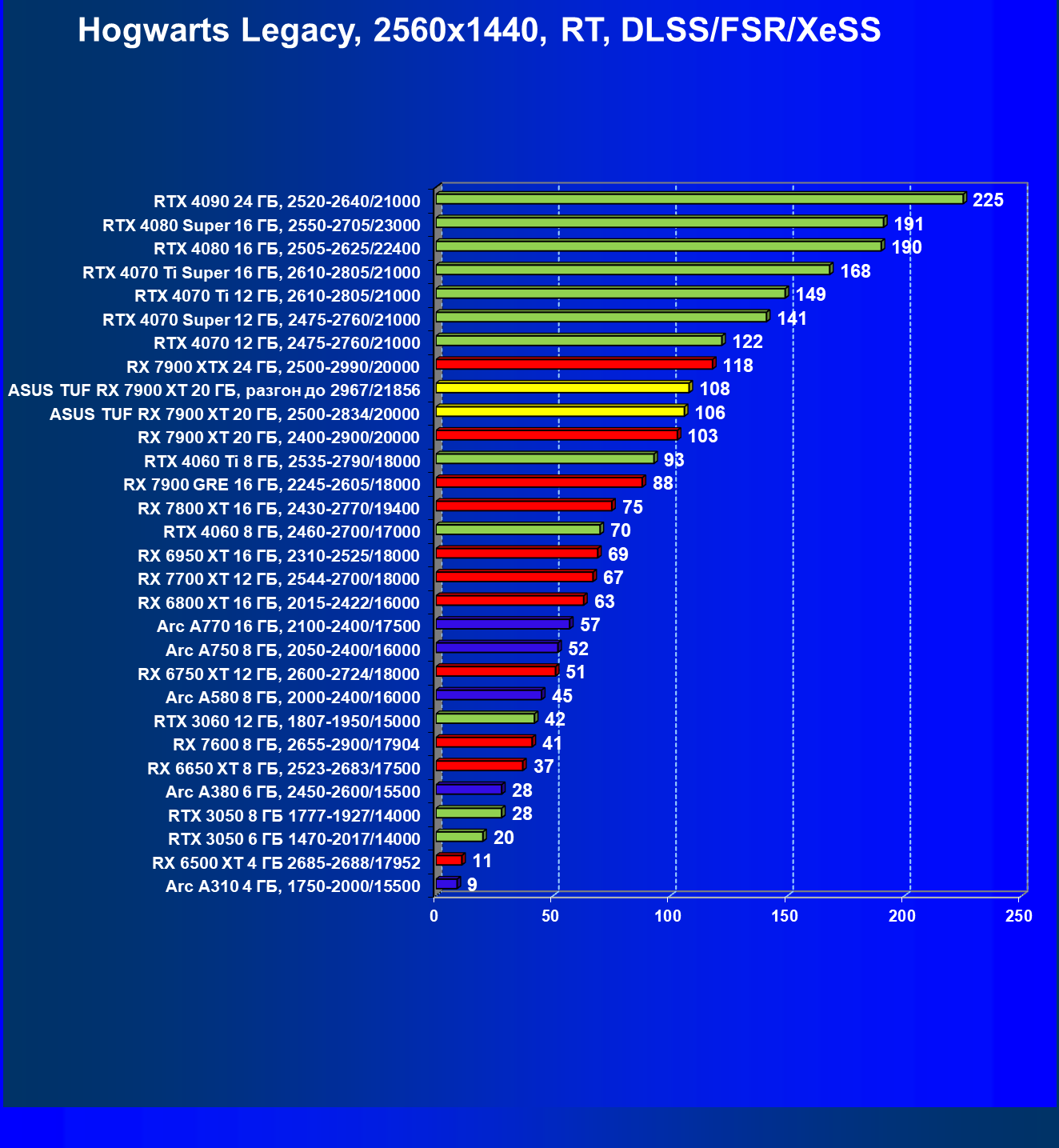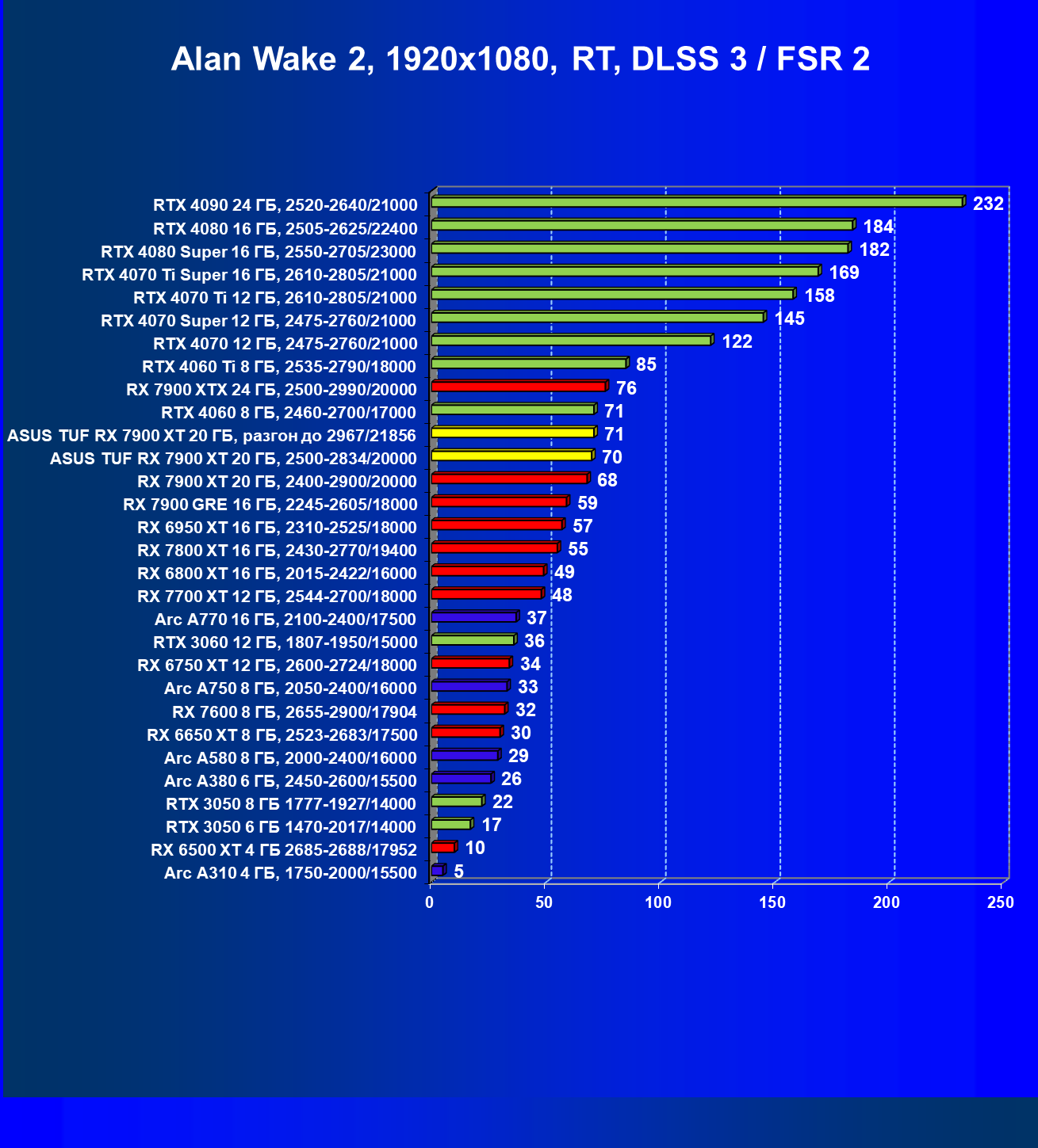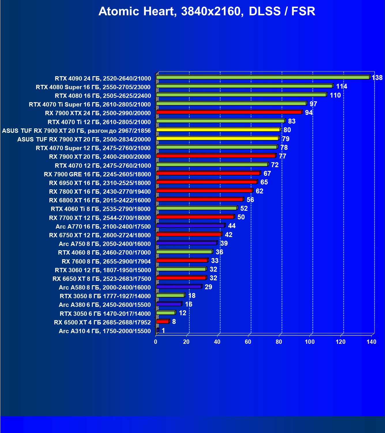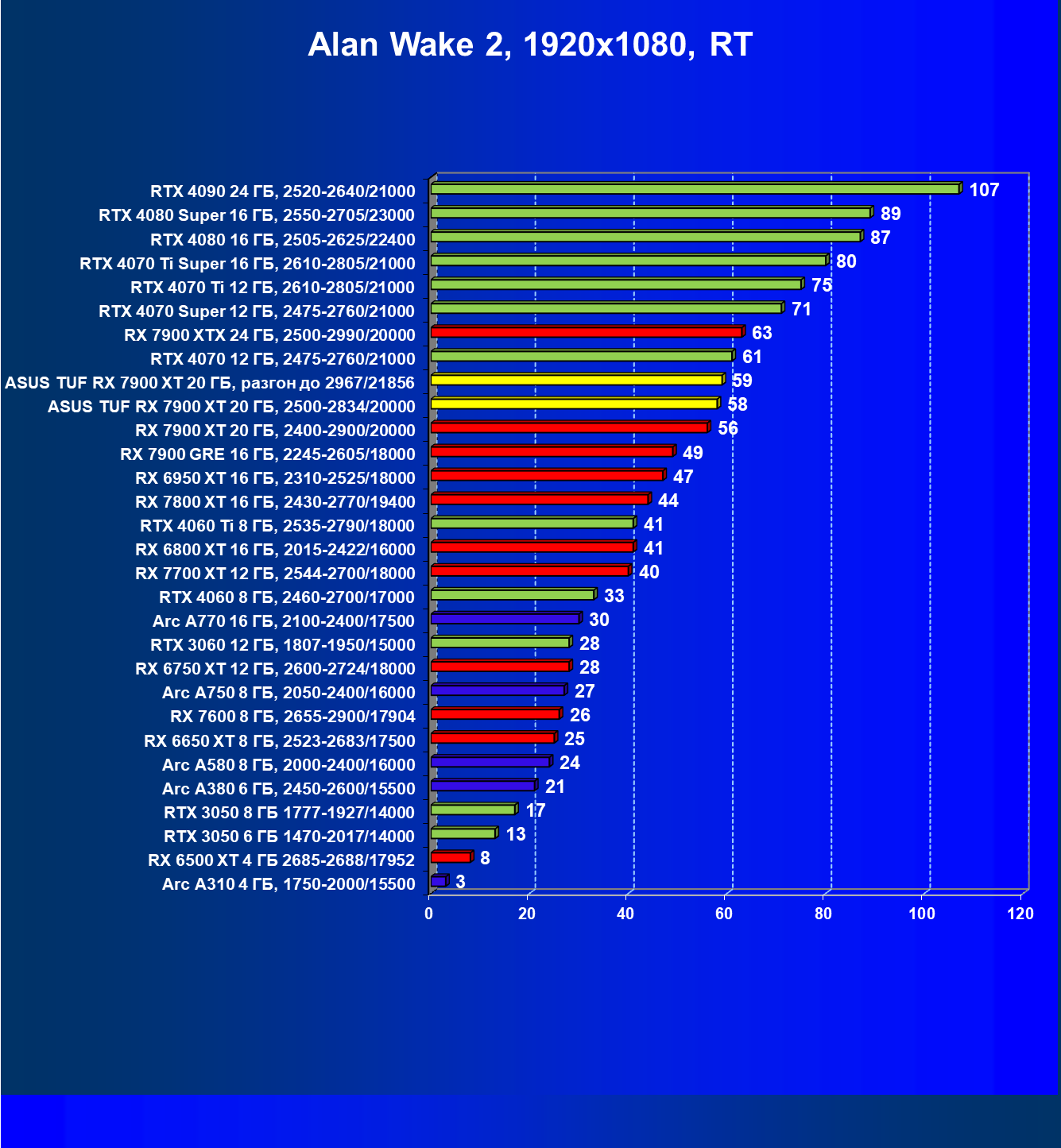 | 24 | Asus TUF RX 7900 XT 20 ГБ, разгон до 2967/21856 | 218 | 2483 | 114 000 |