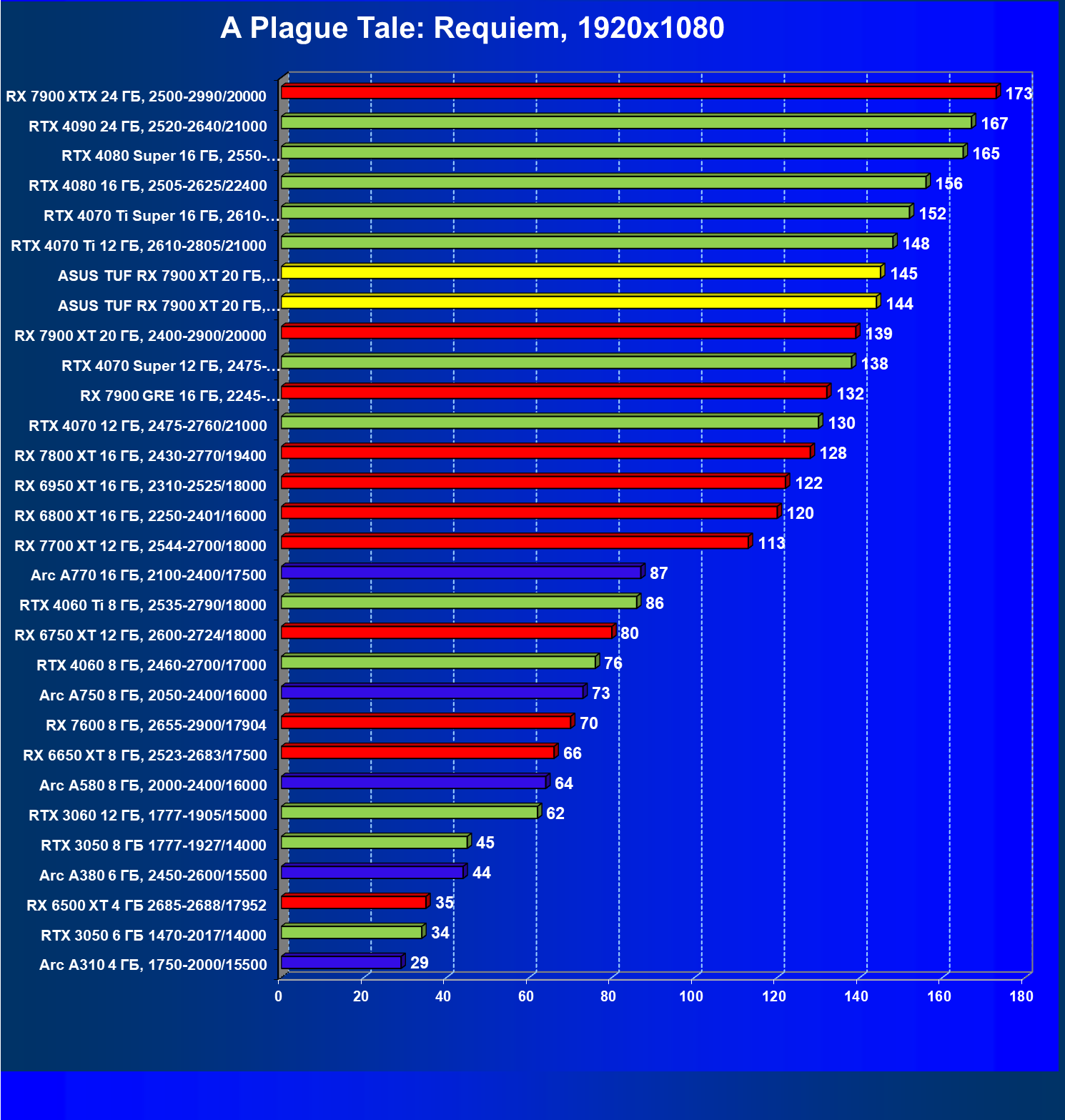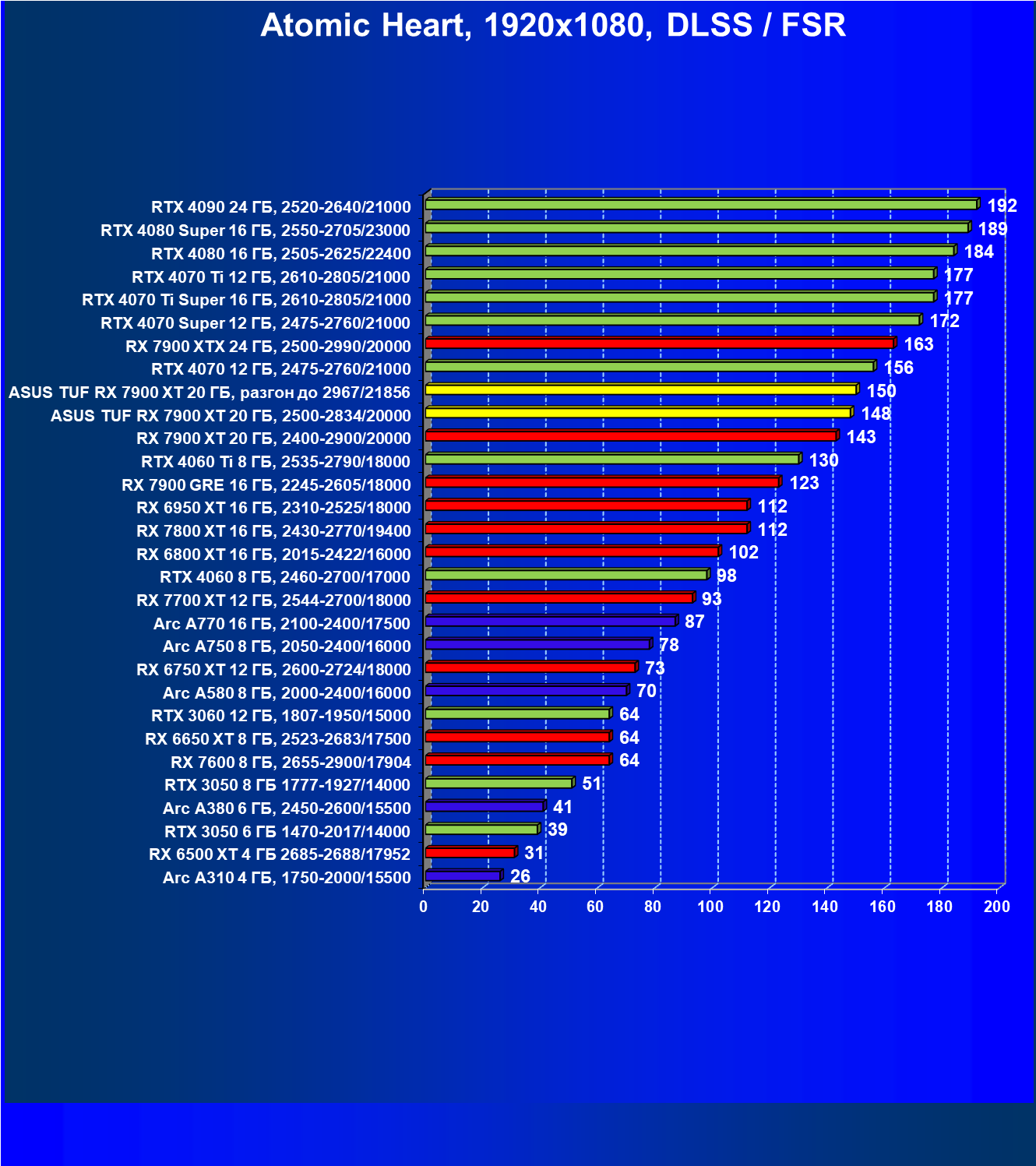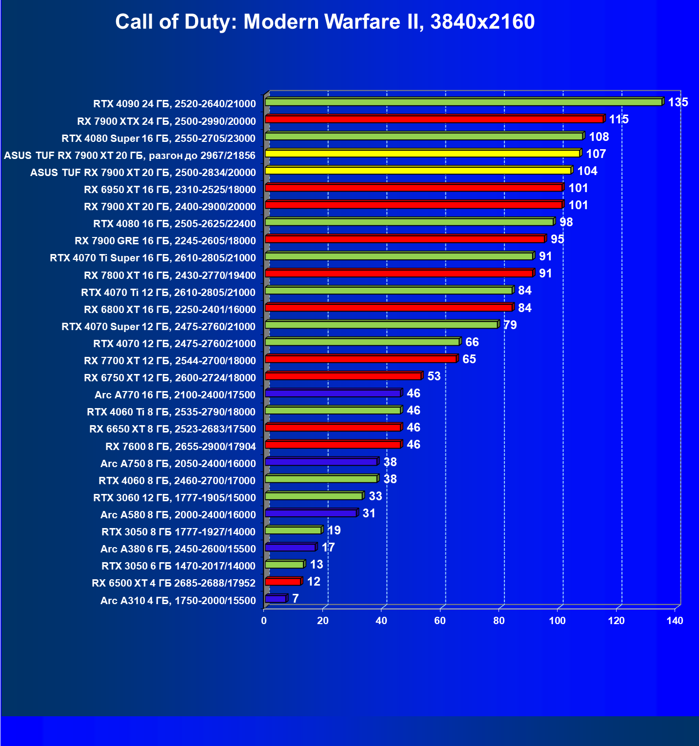 | 17 | RX 7900 XT 20 ГБ, 2400—2900/20000 | 249 | 2365 | 95 000 |