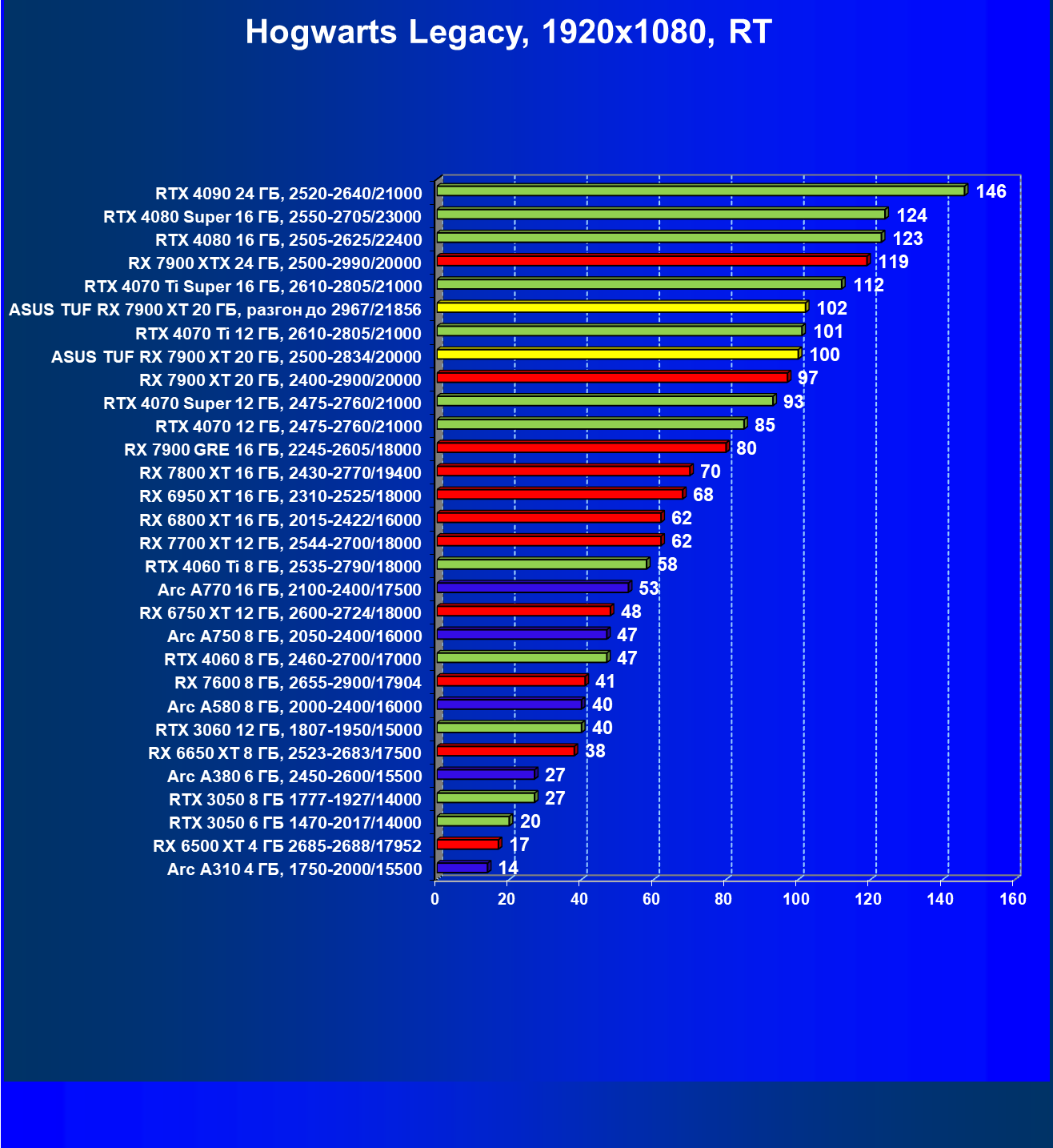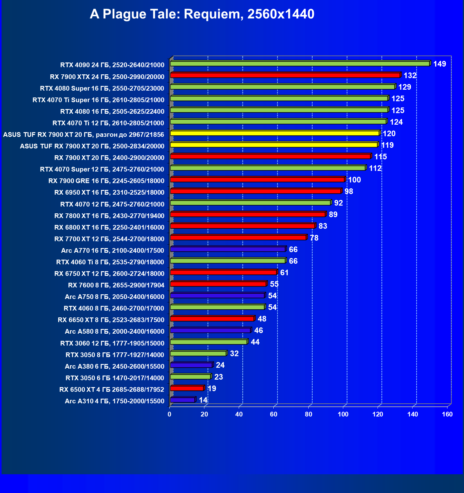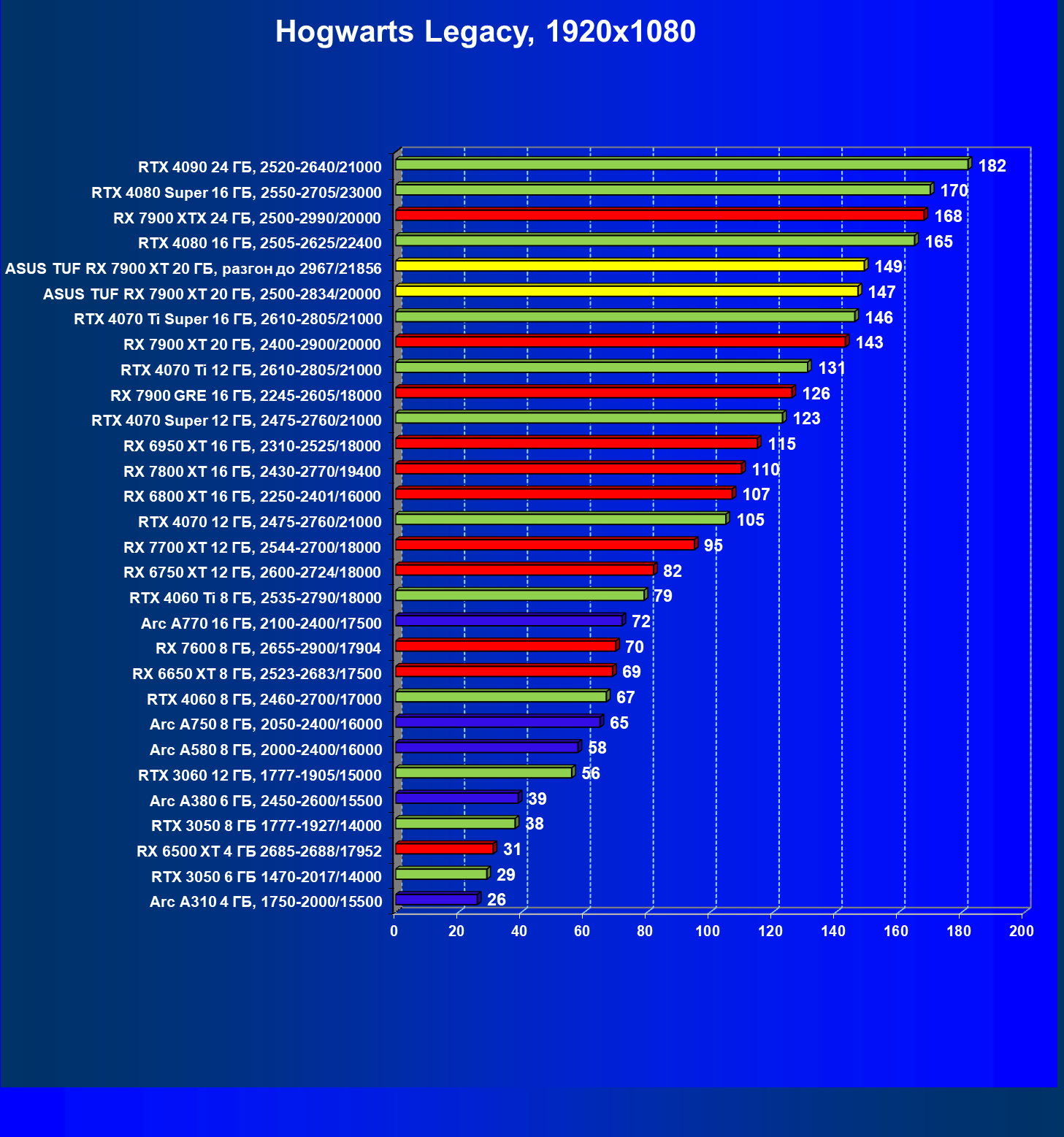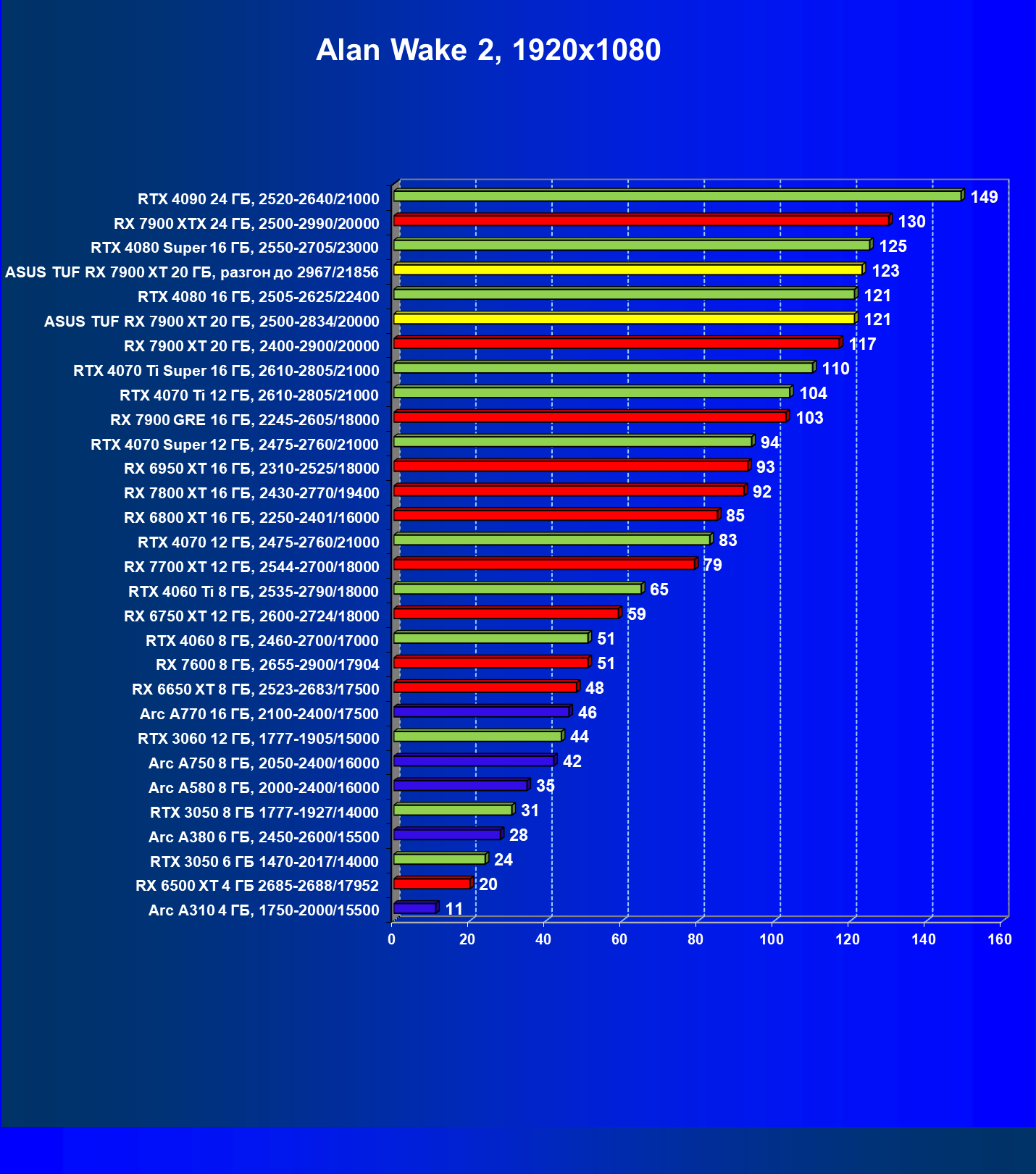 | 17 | RX 7900 XT 20 ГБ, 2400—2900/20000 | 249 | 2365 | 95 000 |