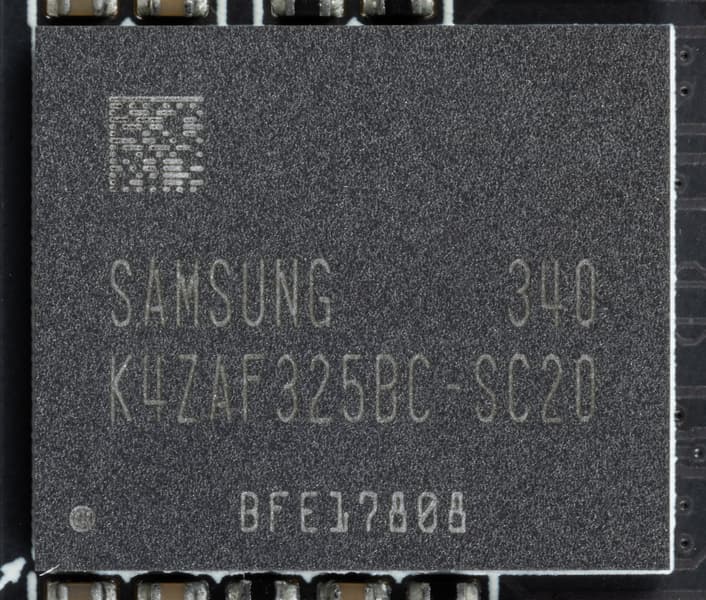 Карта имеет 20 ГБ памяти GDDR6 SDRAM, размещенной в 10 микросхемах по 16 Гбит на лицевой стороне PCB. Микросхемы памяти Samsung (K4ZAF325BC-SC20) рассчитаны на номинальную частоту работы в 2500 (20000) МГц.