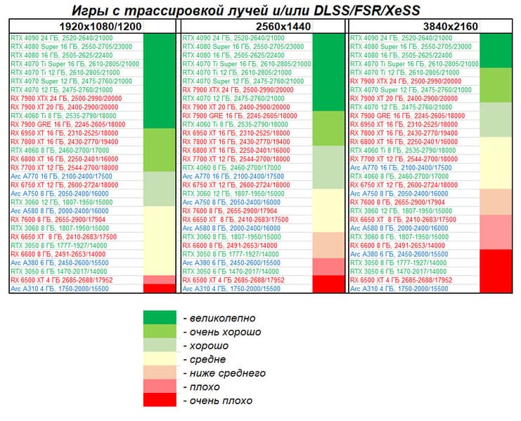 Результаты тестов со включенной аппаратной трассировкой лучей и/или DLSS/FSR/XeSS в разрешениях 1920×1080, 2560×1440 и 3840×2160