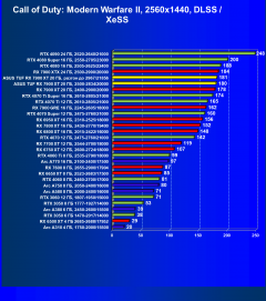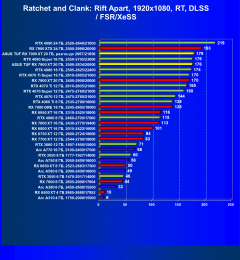 Рейтинг составлен по 9 тестам, в которых используется технология трассировки лучей и одновременно технология Nvidia DLSS, AMD FSR или Intel XeSS. Этот рейтинг нормирован по самому слабому ускорителю в данной группе — Arc A310 (то есть сочетание скорости и функций Arc A310 приняты за 100%).