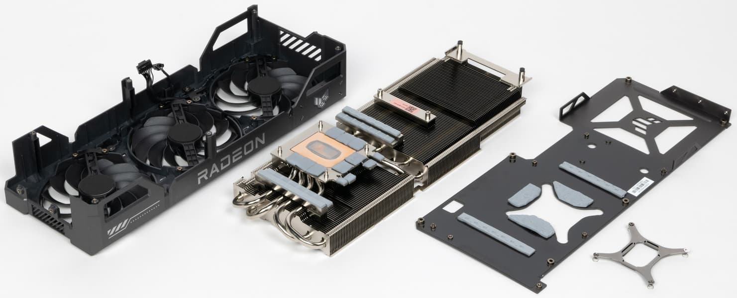 8 трубок припаяны к большой медной никелированной пластине, которая охлаждает как ядро, так и микросхемы памяти. Для охлаждения преобразователей питания VRM имеются свои подошвы на радиаторе. Задняя пластина не только служит элементом защиты PCB, но и участвует в охлаждении тыльной стороны PCB через термопрокладки.
