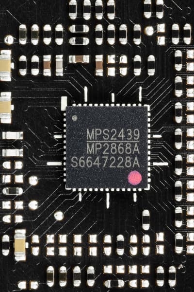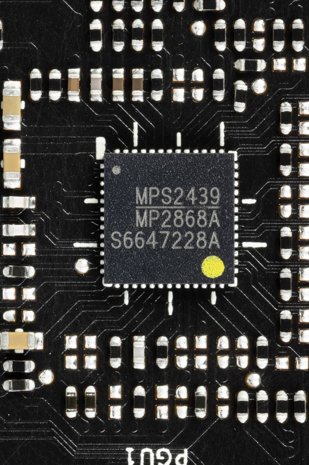 У карты имеется два ШИМ-контроллера Monolithic Power Systems MP2868, они работают в паре и управляют обеими схемами питания.