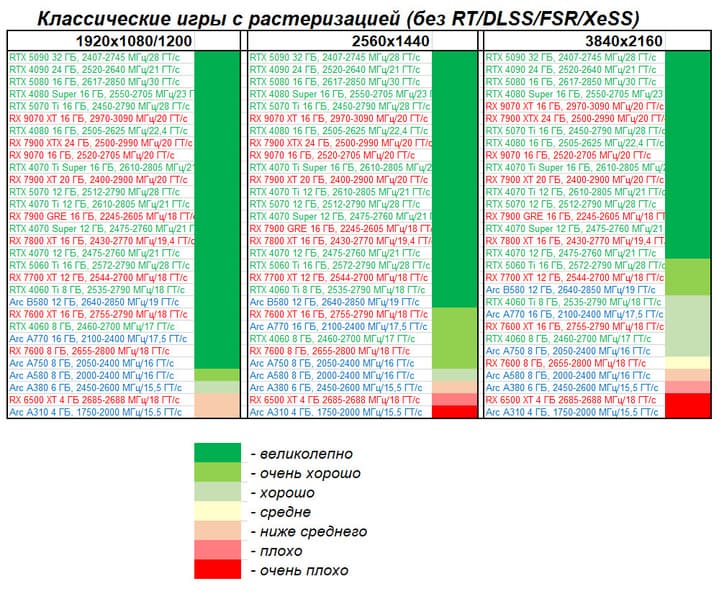 Рейтинг составлен по всем тестам без использования технологий трассировки лучей. Этот рейтинг нормирован по наиболее слабому ускорителю из группы карт — Arc A310 (то есть сочетание скорости и функций Arc A310 приняты за 100%). Рейтинги ведутся по 30 регулярно исследуемым нами акселераторам в рамках проекта Лучшая видеокарта месяца. В данном случае из общего списка выбрана группа карт для анализа, в которую входят Radeon RX 9070 XT и его конкуренты.