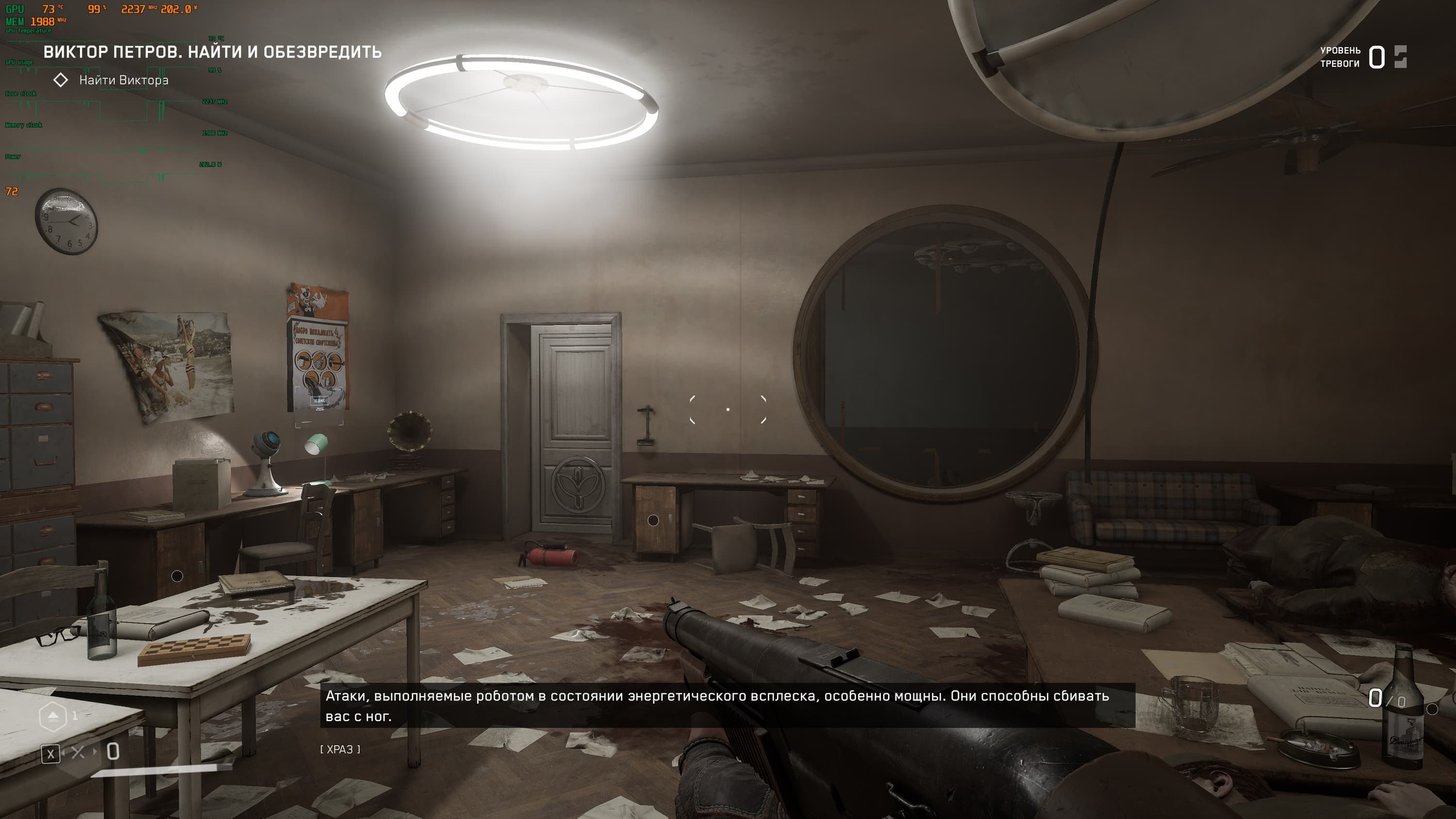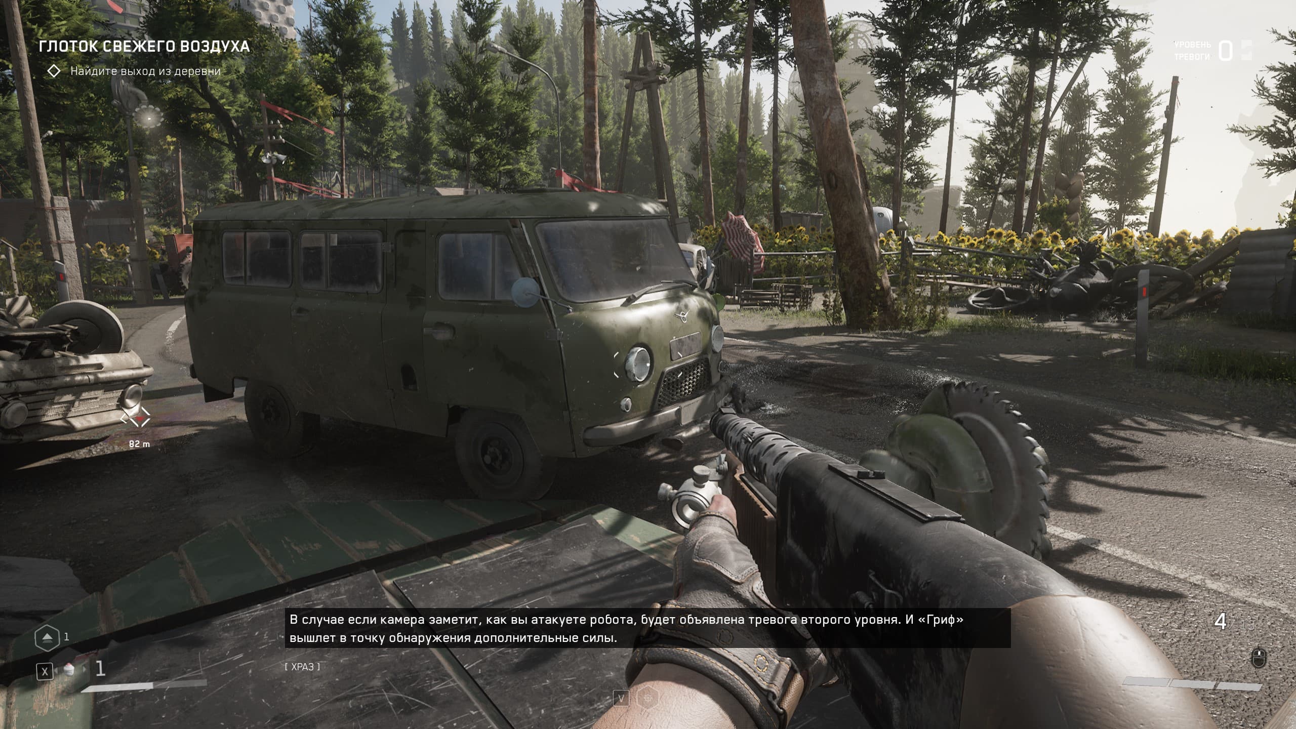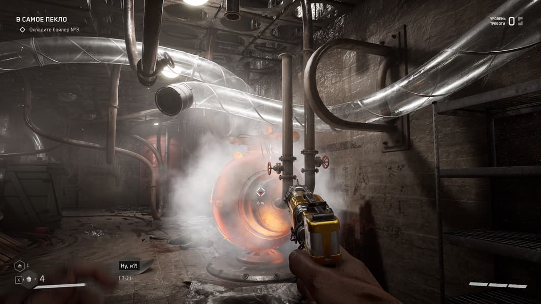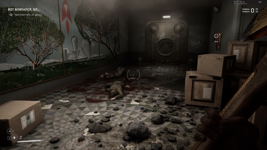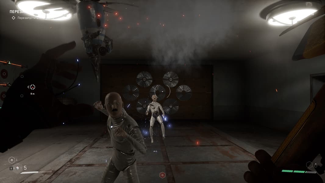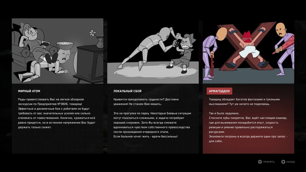 Продолжительное время мы проводим в 3826-м инновационном центре Советского Союза, а точнее на его подземных этажах и корпусах, где нет карты для понимания, где что и куда бежать. Кратко говоря, мы наугад бегаем из комнаты в комнату, параллельно уничтожая приставучих роботов и мутантов, а так же решаем различного рода загадки. Спустя какое-то время игра позволит нам выбраться на свежий воздух и противостоять уже некоторым другим роботам (у которых на вооружении железные диски для резки всего и вся, и которыми они кидаются). Гуляем по территории ВДНХ и всеми силами стараемся прекратить безумие роботов.