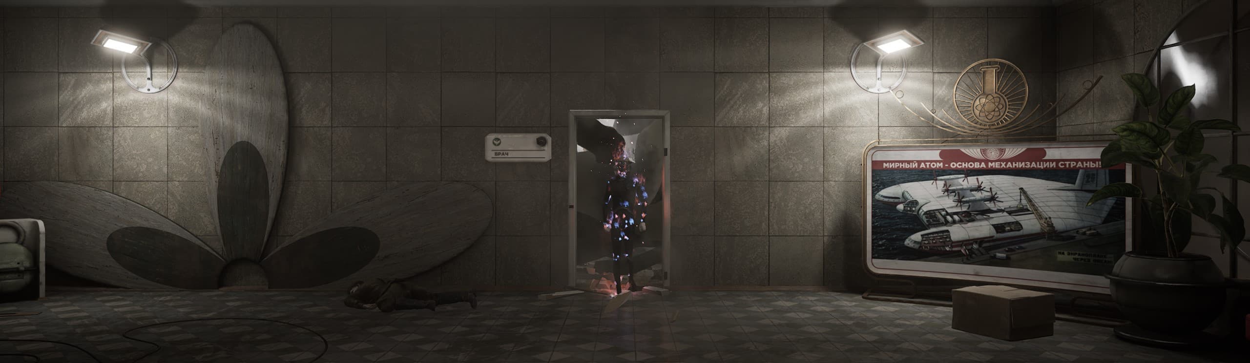 Игра Atomic Heart наполнена очерками послевоенного времени, которые красиво реализованы, и мы можем наблюдать все это в великолепно прорисованных сценах. Можно уверенно считать, что это один из весомых плюсов игры, даже где-то главным козырем. Обилие тематических плакатов и книг, чайников и остальных объектов того времени — просто запредельное.