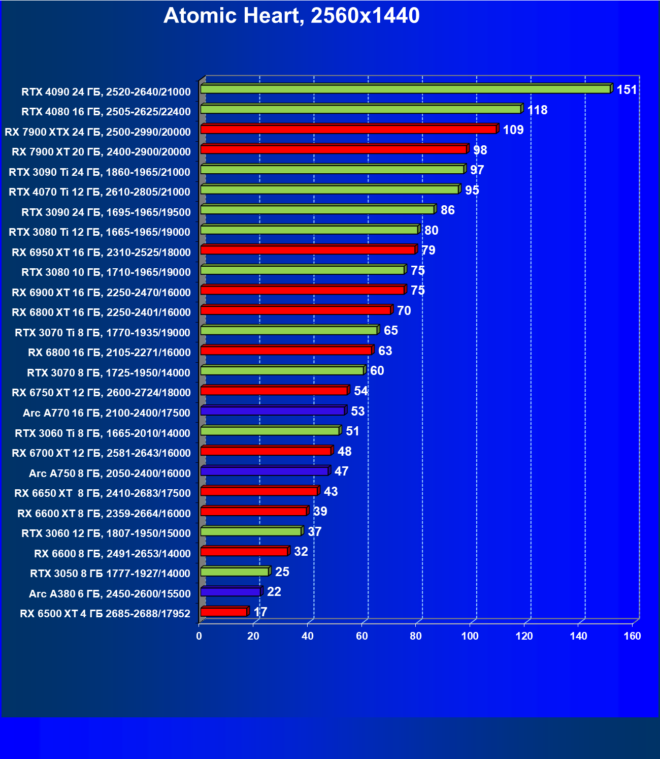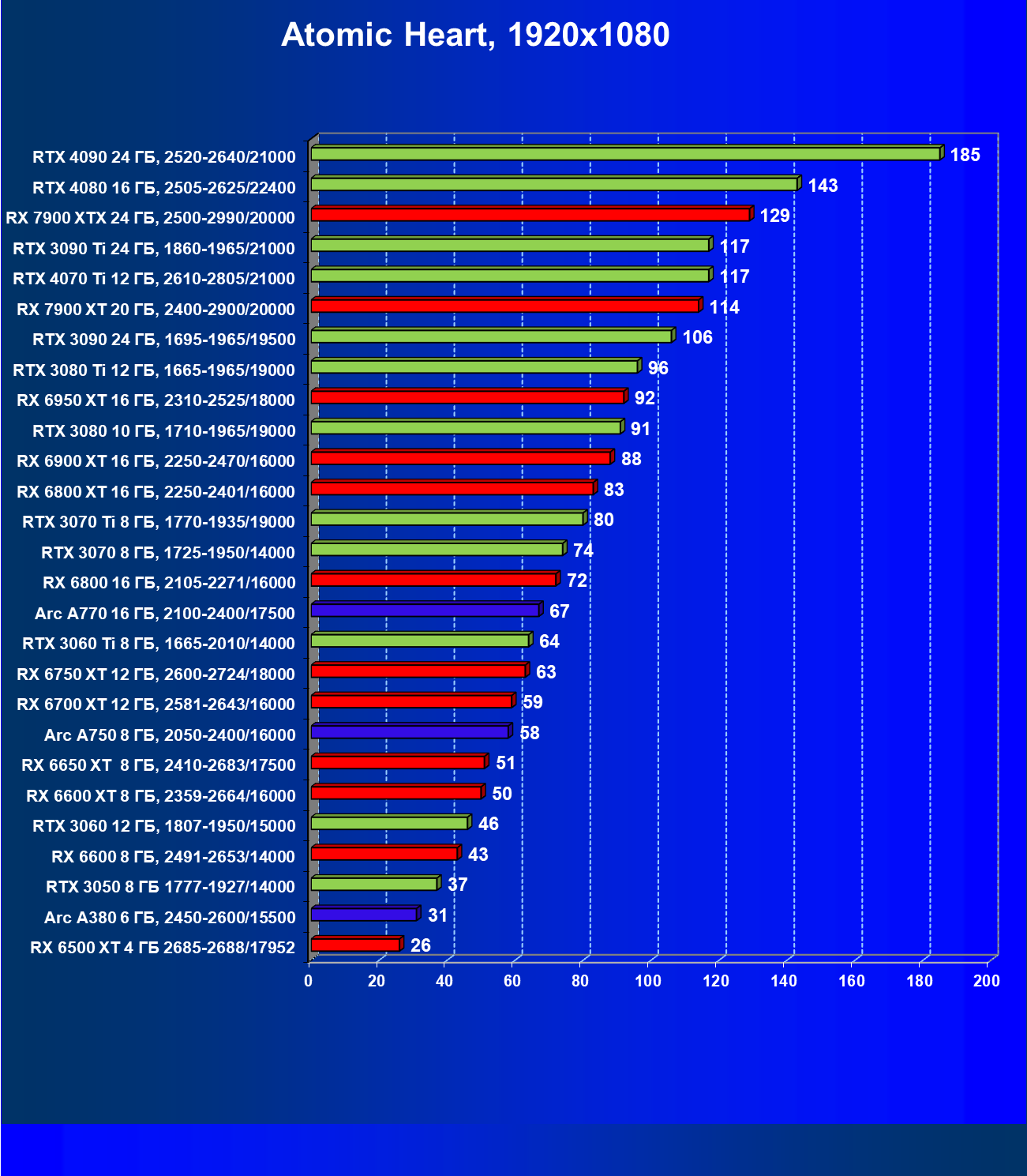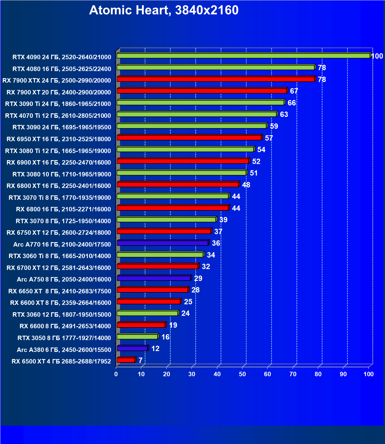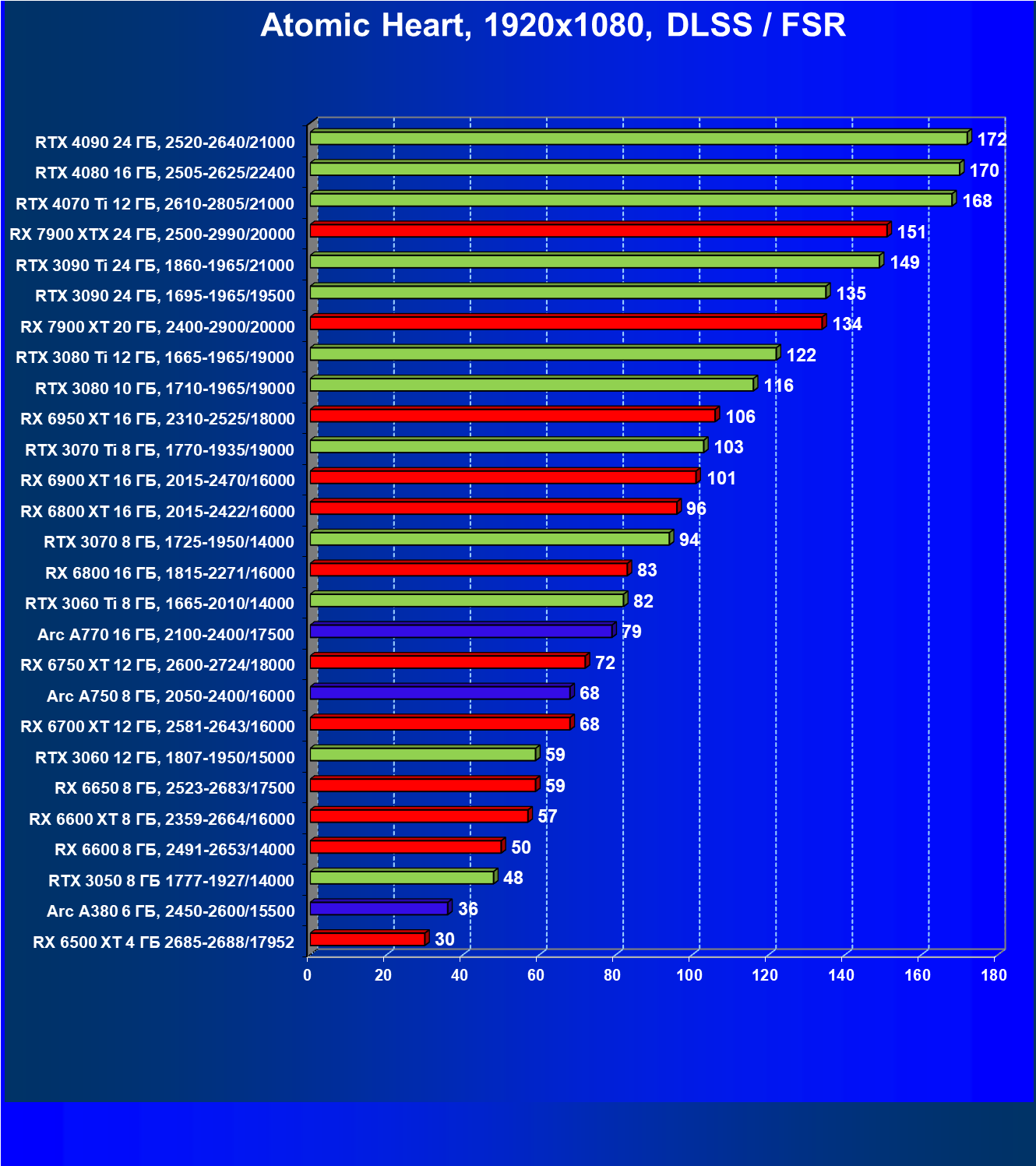 Если рассматривать самое популярное разрешение Full HD, то для того, чтобы играть на максимальных настройках графики, нужно вооружиться GeForce RTX 3060 Ti, Radeon RX 6700 XT или Intel Arc 770. В разрешении 2.5K достаточную производительность обеспечат GeForce RTX 3070 и Radeon RX 6800 XT. В разрешении 4K для комфорта потребуется GeForce RTX 3090 и Radeon RX 7900 XT. А для гарантированного полного комфорта в том же 4K лучше использовать GeForce RTX 4080 или Radeon RX 7900 XTХ.