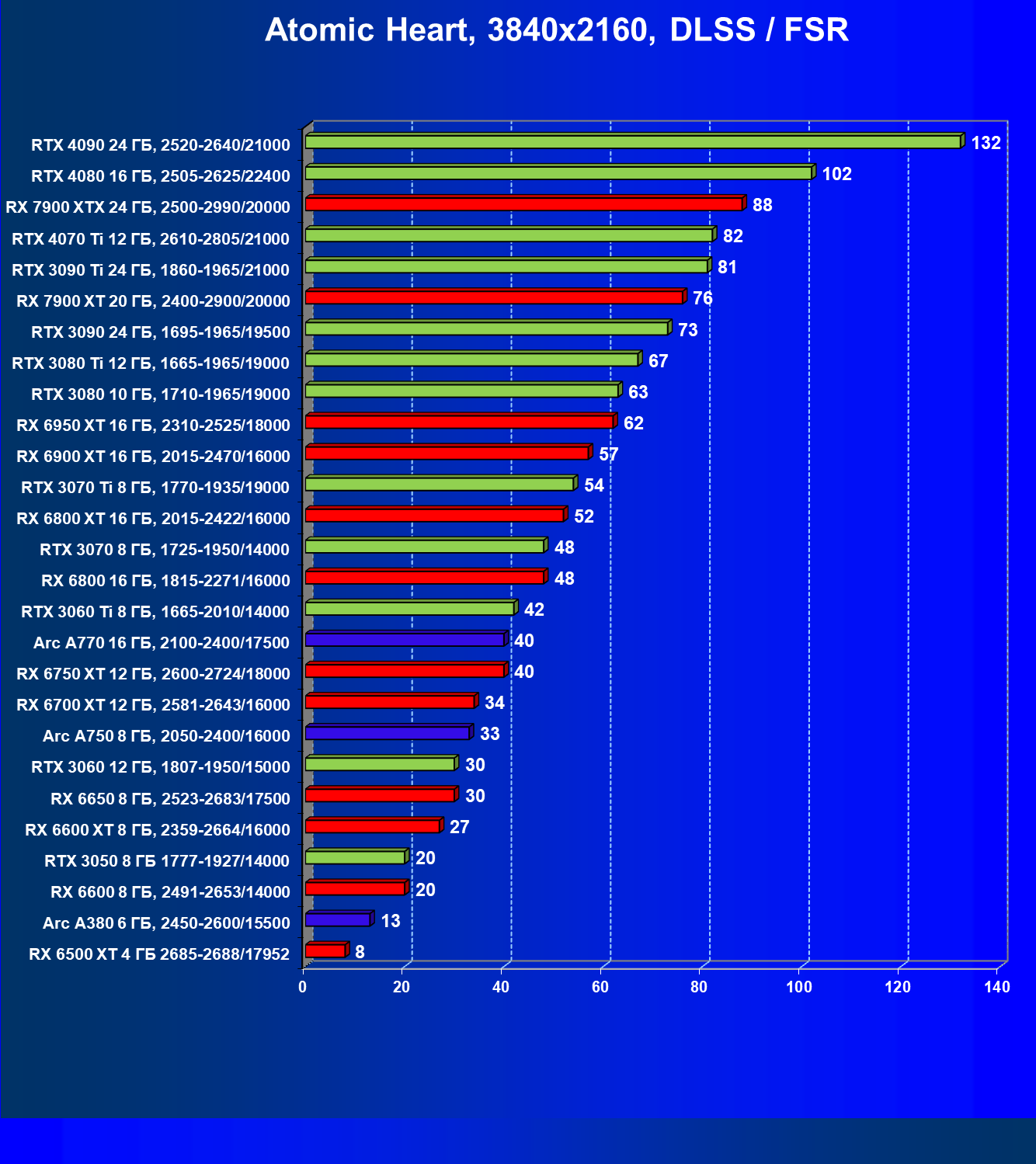 В разрешении Full HD при включении DLSS/FSR нужно вооружиться GeForce RTX 3060, Radeon RX 6650 XT или Intel Arc 750. В разрешении 2.5K достаточную производительность обеспечат GeForce RTX 3060 Ti, Radeon RX 6750 XT и Intel Arc 770. В разрешении 4K для комфорта потребуется GeForce RTX 3080 и Radeon RX 6950 XT.