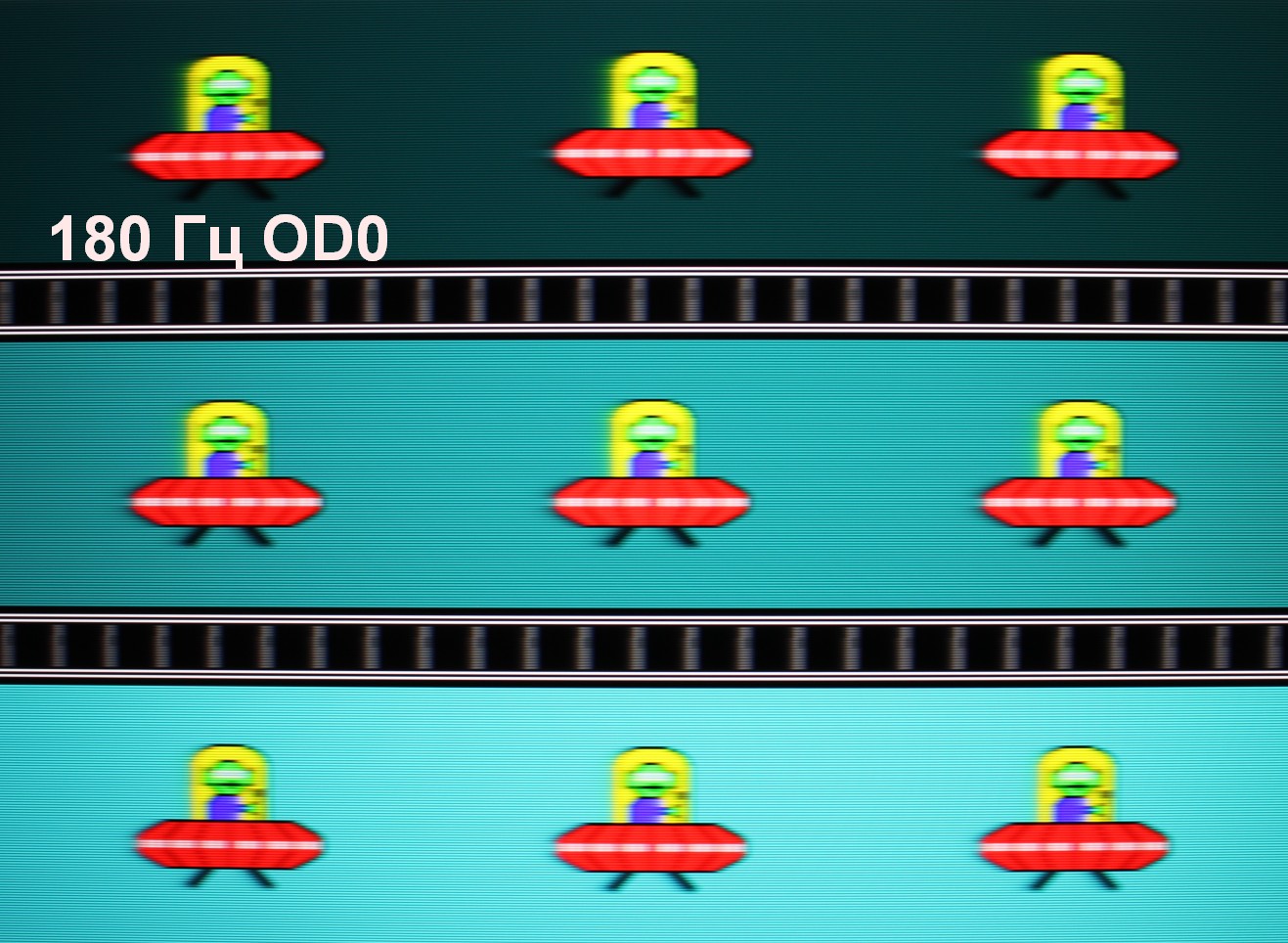 Для наглядного представления о том, что на практике означает такая скорость матрицы, какие могут быть артефакты от разгона и повышает ли четкость в движении, описанная выше настройка MPRT, приведем серию снимков, полученных с помощью движущейся камеры. Такие снимки показывают, что видит человек, если он следит глазами за двигающимся на экране объектом. Описание теста приведено тут, страница с самим тестом тут. Использовались рекомендованные установки (скорость движения 960 пиксель/с для частот обновления 60, 120 Гц и 900 пиксель/с для 180 Гц), выдержка 1/15 с, на фотографиях указаны значения частоты обновления, а также ступень разгона (ODx) и включен ли режим MPRT.