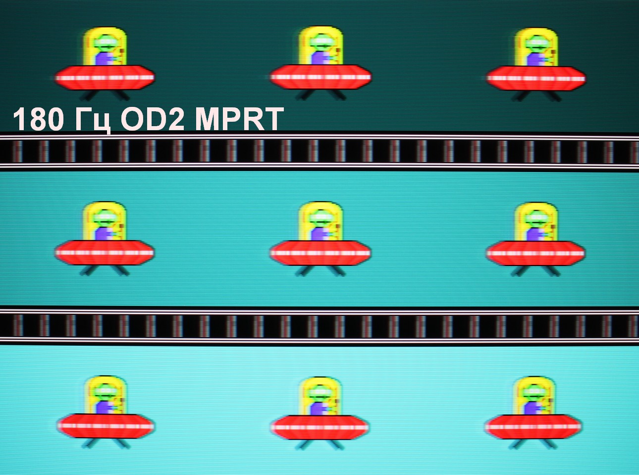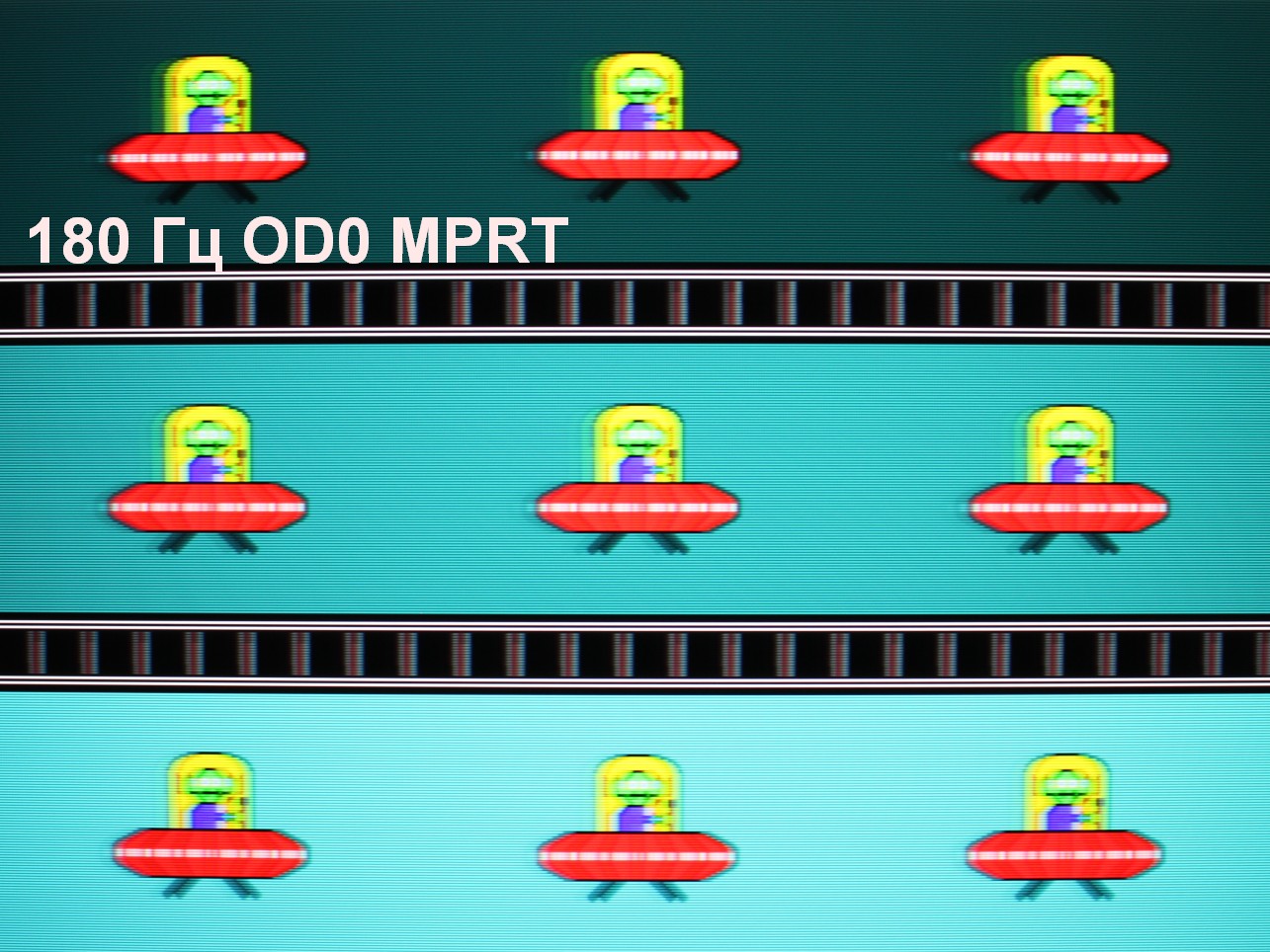 Видно, что при прочих равных условиях четкость изображения повышается по мере роста частоты обновления и степени разгона, и даже на максимальном разгоне артефакты не очень заметные. Включение MPRT увеличивает четкость вплоть до одного пикселя по горизонтали, но объекты в движении приобретают паразитные копии со снижающейся яркостью, что снижает положительный эффект. С нашей точки зрения оптимальным по четкости является режим 180 Гц с максимальным разгоном при выключенной функции MPRT.