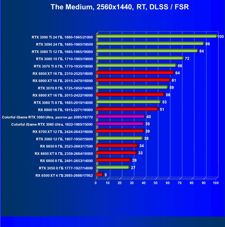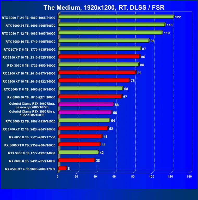 А вот в играх с трассировкой лучей карта Colorful является лидером, она даже обгоняет RX 6650 XT.