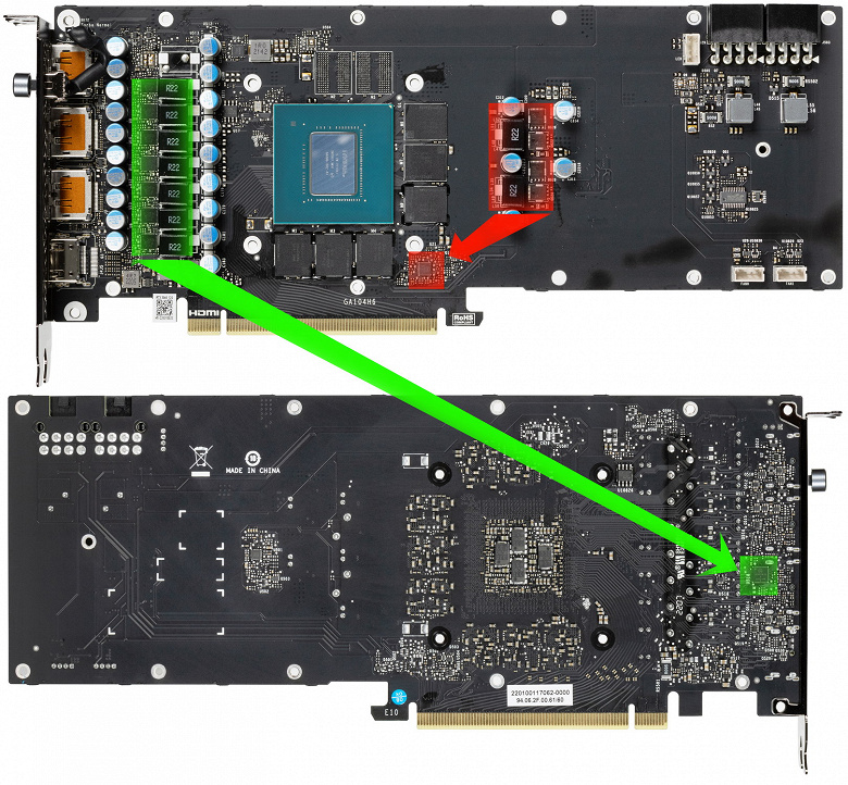 Зеленым цветом отмечена схема питания ядра, красным — памяти. ШИМ-контроллер NCP81610 (On Semiconductor) отвечает за работу фаз питания графического процессора. Он находится на оборотной стороне PCB.