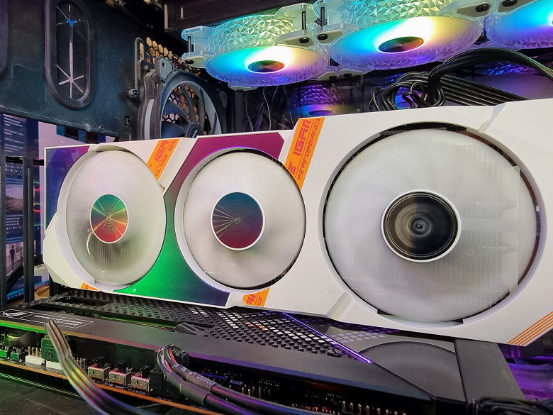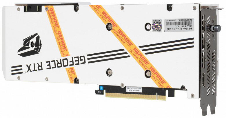 У карты Colorful эффективный и негромкий кулер, он мог бы использоваться и на картах со старшими GPU. По габаритам карта вписывается в устоявшиеся стандартные значения, занимает три слота в системном блоке, имеет 4 видеовыхода (3 DP 1.4a и 1 HDMI 2.1), получает питание через два 8-контактных разъема.