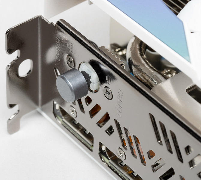 Карта имеет два варианта BIOS, которые отличаются не только параметрами работы вентиляторов СО, но и рабочими частотами. Переключение выполнено в виде кнопки One-Key OC (Turbo) на крепежной планке карты, так что переключаться можно, не открывая ПК. Но переключать версию BIOS можно только у выключенного ПК!