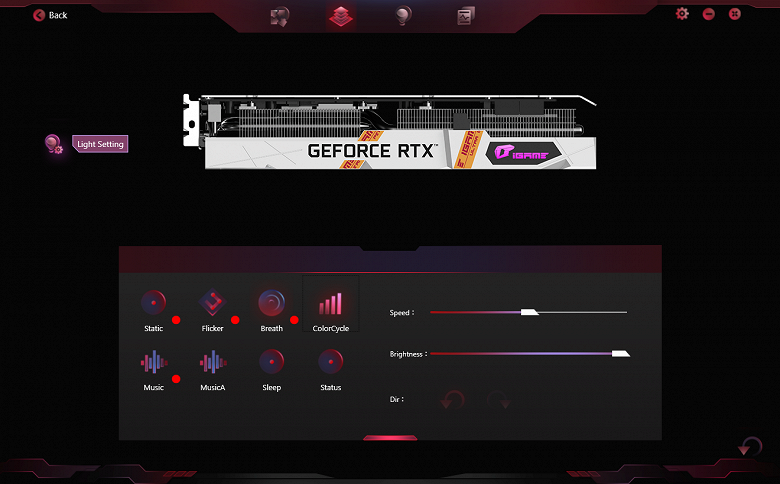 Управление режимами подсветки, в том числе и ее отключением, осуществляется той же утилитой iGame Center.
