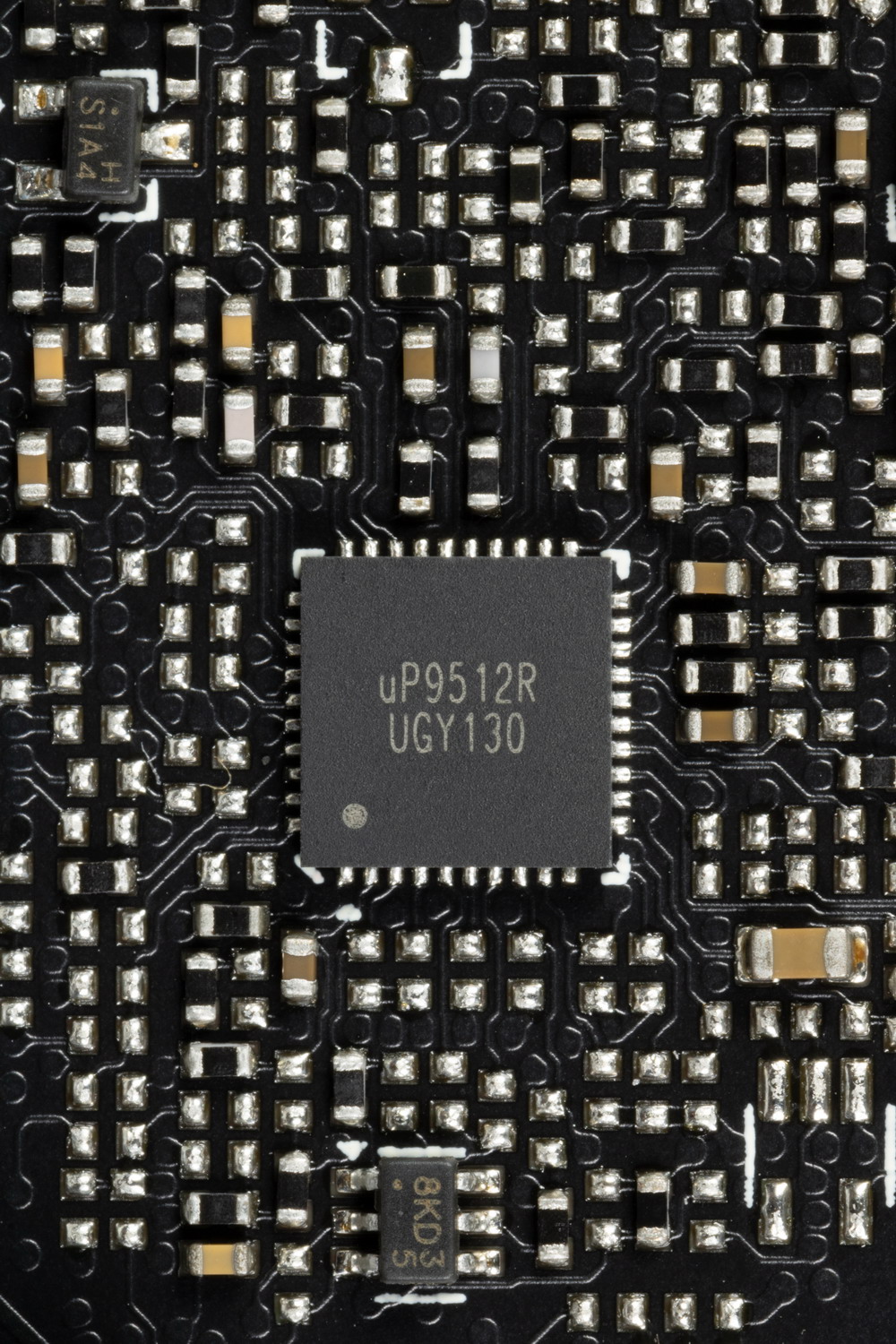 На лицевой стороне карты имеется еще один ШИМ-контроллер uP9512R производителя uPI Semiconductor, который управляет уже четырехфазной схемой питания десяти микросхем памяти.