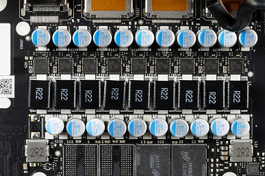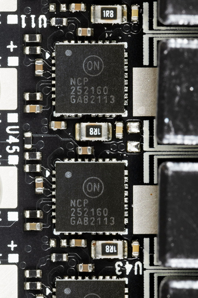 В преобразователе питания у карты Colorful применены DrMOS — NCP252160 (On Semiconductor), рассчитанные на максимальный ток 50 А.