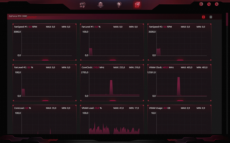Разумеется, подсветка не ограничивается лишь красным цветом, можно включать многоцветные режимы через данную программу. Синхронизации подсветки с матплатами через провод нет, однако, например, утилита Armoury Crate от Asus распознает данную видеокарту и позволяет синхронизировать ее подсветку с материнской платой от того же Asus.