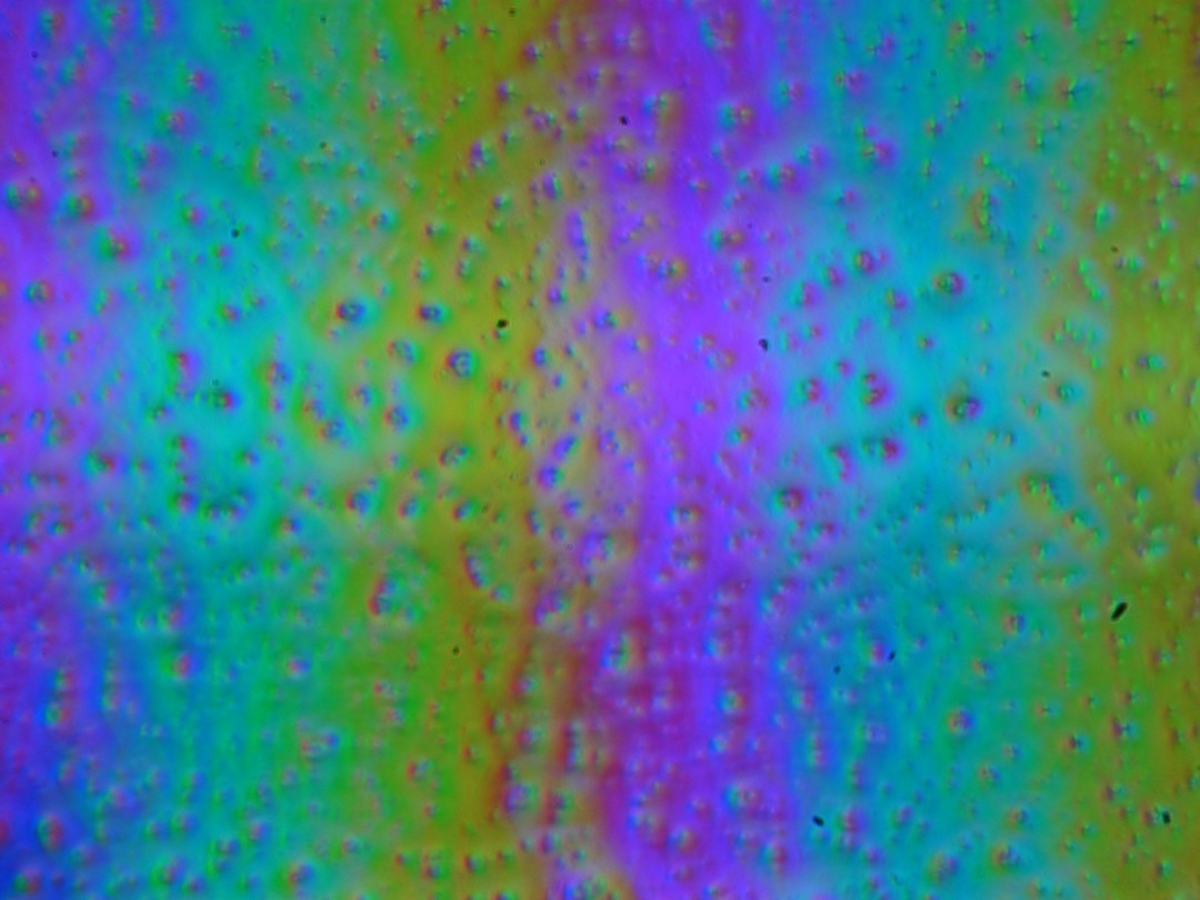 Зерно этих дефектов в несколько раз меньше размеров субпикселей, поэтому фокусировка на микродефектах и «перескок» фокуса по субпикселям при изменении угла зрения выражены слабо, из-за этого нет и «кристаллического» эффекта.