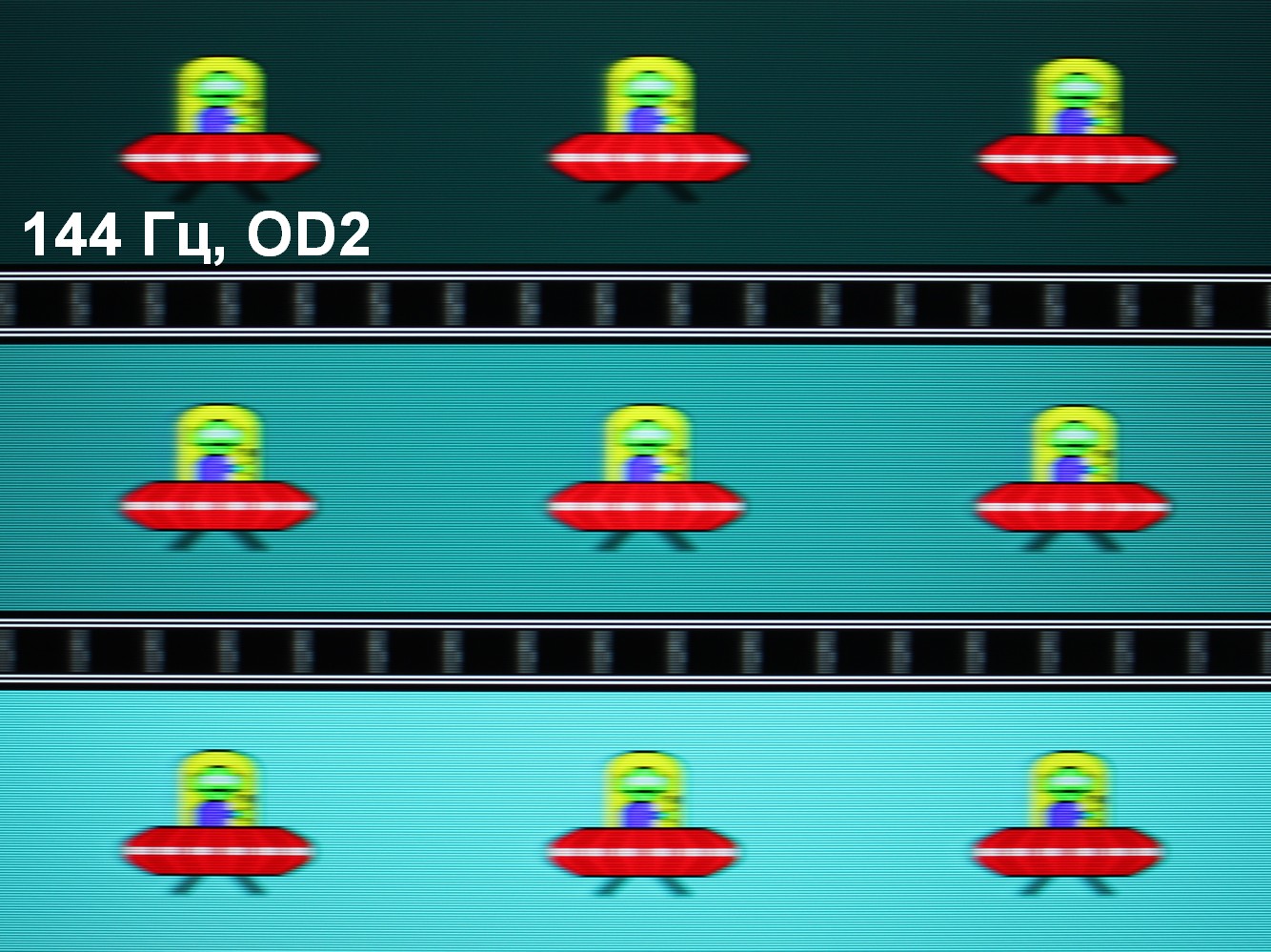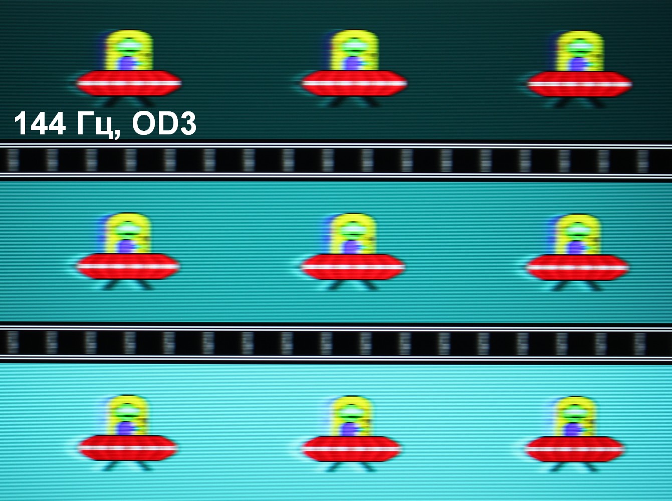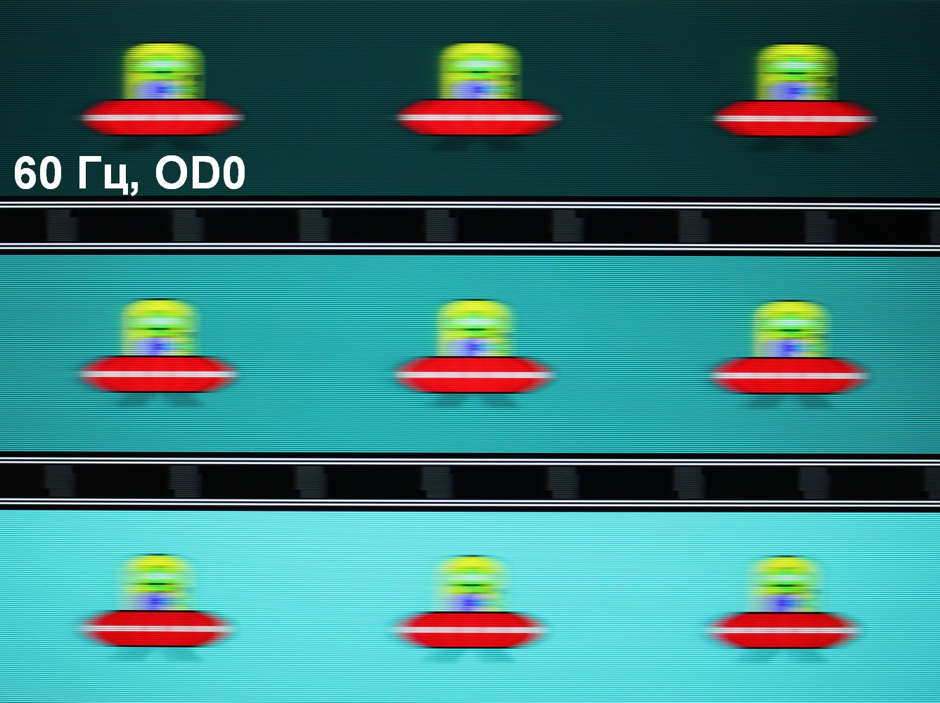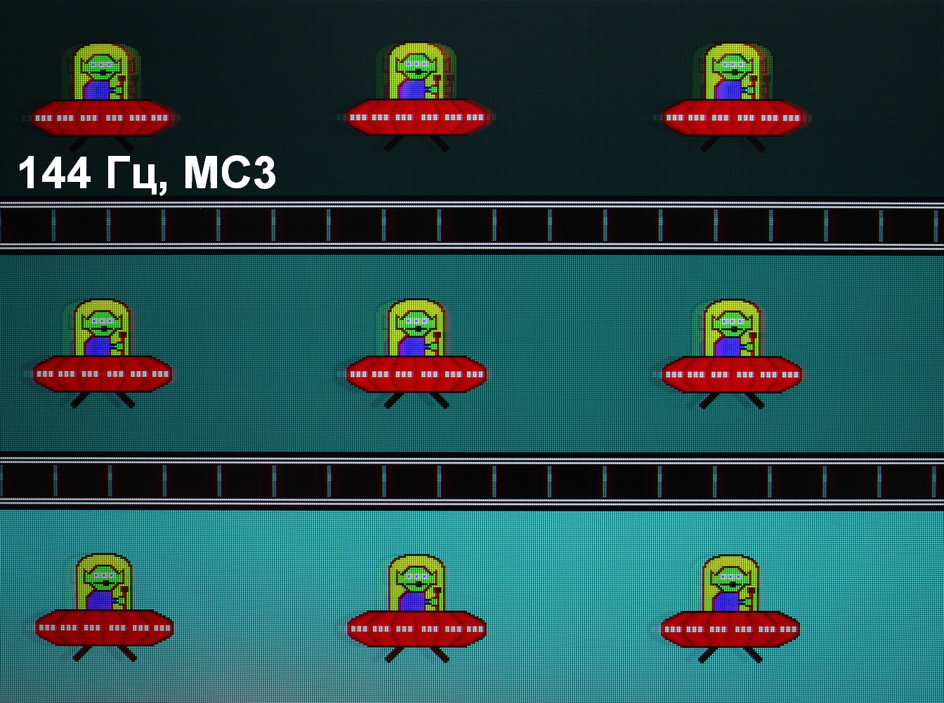Для наглядного представления о том, что на практике означает такая скорость матрицы, какие могут быть артефакты от разгона и повышает ли четкость в движении, описанная выше настройка Motion Clearness, приведем серию снимков, полученных с помощью движущейся камеры. Такие снимки показывают, что видит человек, если он следит глазами за двигающимся на экране объектом. Описание теста приведено тут, страница с самим тестом тут. Использовались рекомендованные установки (скорость движения 960 пиксель/с для частот обновления 60 и 120 Гц и 1008 пиксель/с — для 144 Гц), выдержка 1/15 с, на фотографиях указаны значения частоты обновления, а также ступень разгона (ODx) и ступень режима Motion Clearness (MCx). Отметим, что при включении Motion Clearness настройка OverDrive недоступна.